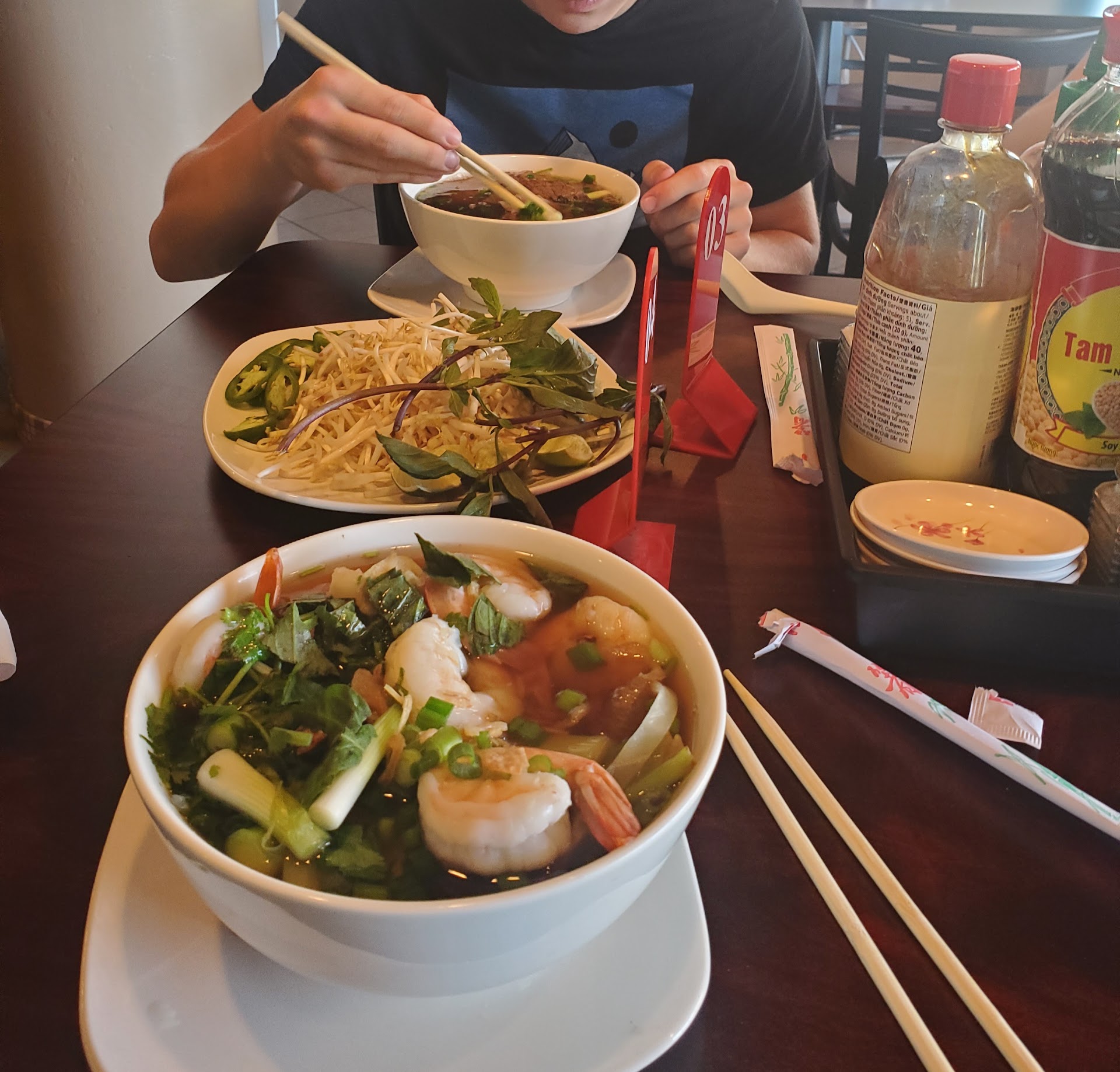Read moreI got the shrimp pho with extra vegetables. My friends got brisket and steak phos, one thing we appreciated was the broth in each bowl had a distinct taste from the others. The steak wasn't quite rare, but still good. It wasn't described what sort of extra vegetables I was signing up for... that might be a good thing to add to your kiosk menu. Each portion was a good amount, we were well filled for our money. The flavors were delicious and the service was good. We also each bought milk tea with boba in different flavors, I really enjoyed my taro milk tea, especially since I was able to choose the sweetness level. They make their drinks very sweet if you don't choose a "less sweet" option! I loved the additional plate of lime, sprouted beans, and Asian basil that came with our order, and they tasted great, but they weren't as fresh as they could have been. Overall, I give five stars because I loved this spot, it has good service, good food, good potential, and they are still on a learning curve. I hope you guys...