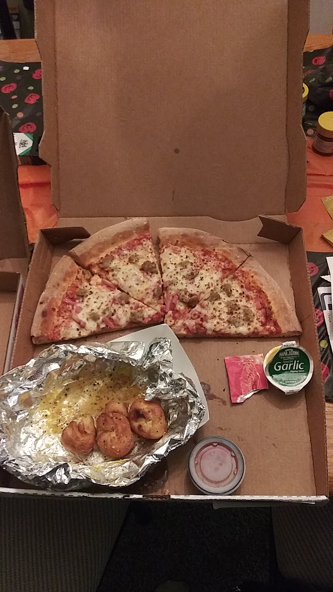 Read moreThe Papa John's I order from is less than 5 minutes away, only about 1 mile and 1 turn from my house. So when I received the notification that my order was "on it's way", my family and I got ready for a delivery (putting the dogs outside, getting plates, etc), but when the driver pulled up 30 minutes later we were a little upset and expressed this to the driver. I would like to thank the driver for being honest with us and telling us that Papa John's waits to deliver orders until they have multiple orders for the driver to deliver at the same time. So now the customers have to wait for enough orders to pile up before delivery and THEN wait for their place in the delivery, even though the customers have been notified that their order is "on it's way". The food is going to get cold, the customers are going to get irate (being notified is great, being notified about something that is not happening, is infuriating), and so the drivers get the blunt end of the manager's decision to "streamline" delivery. How about you worry about your customers getting their orders on time instead of saving money by having your drivers running back to the store after every single order??? Maybe hire another...