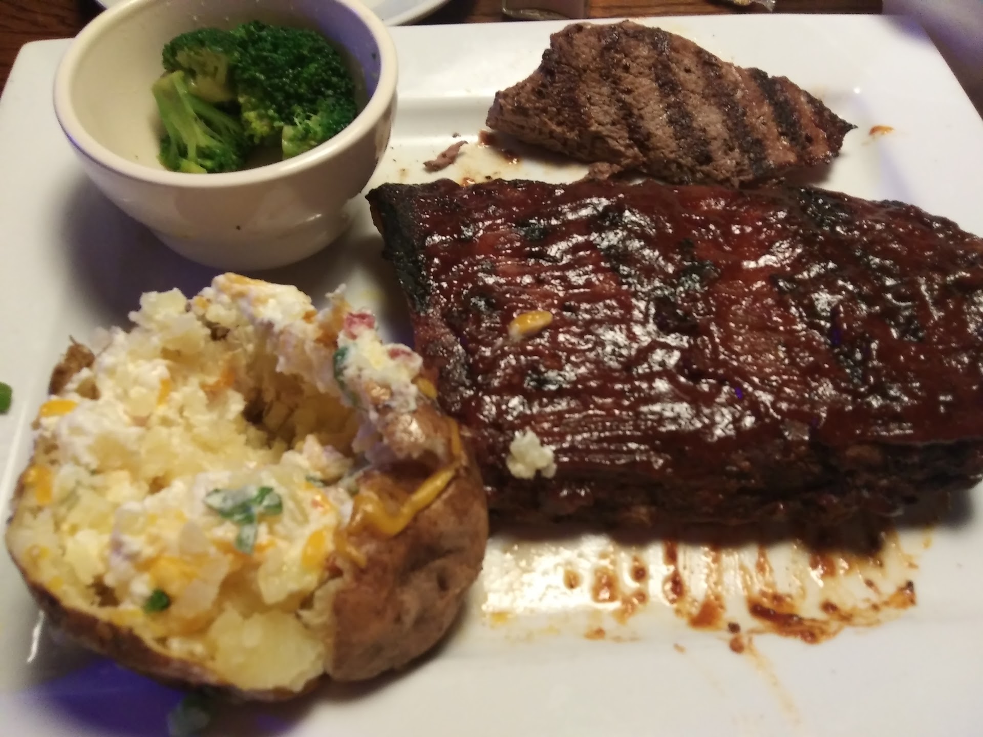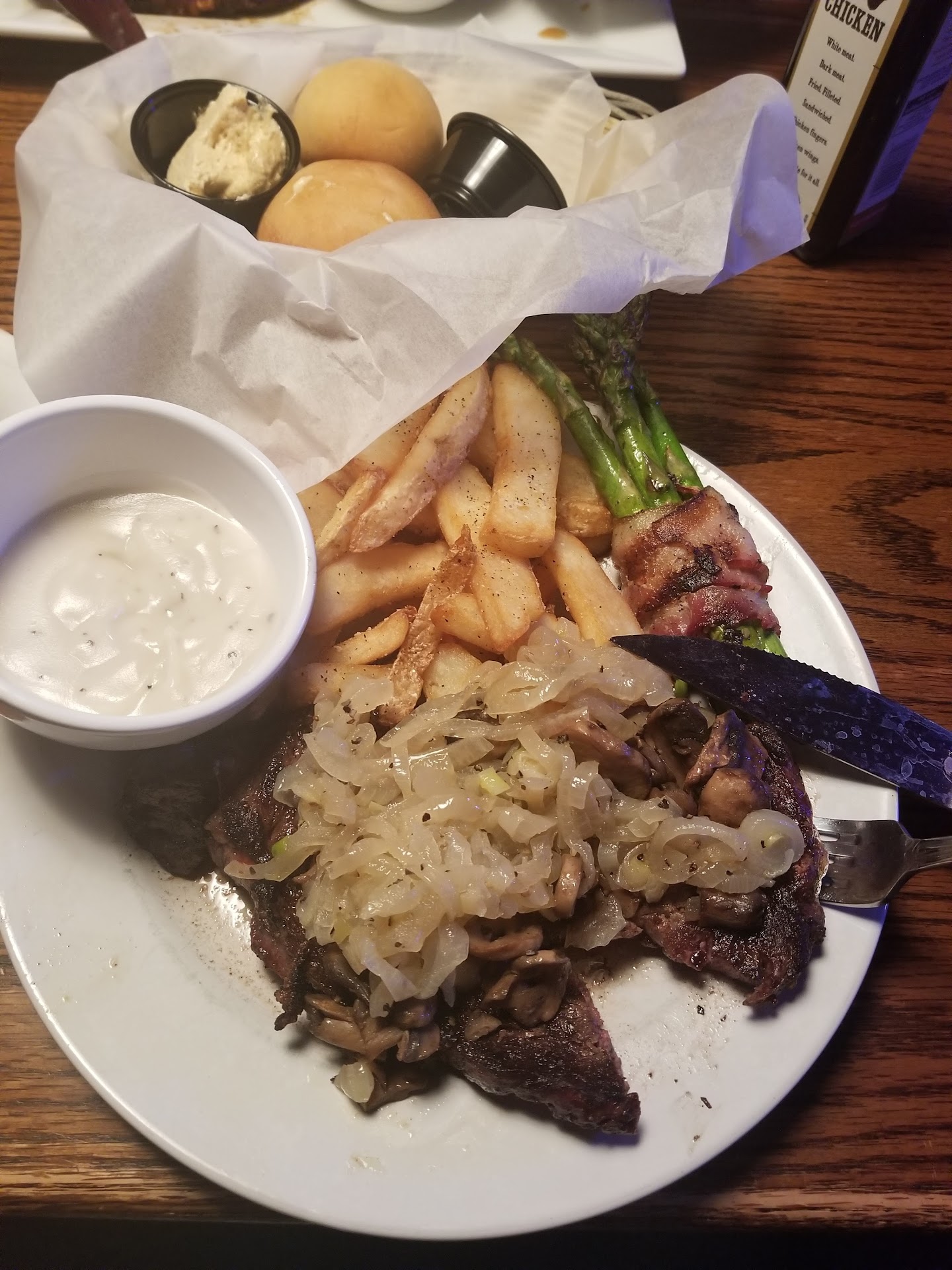 Read moreAs a single-income family, we'd never had the opportunity to eat here but had frequently mentioned wanting to try it. Valentine's Day was our reasonable excuse to try it. I called to ask if they accepted reservations. They do, generally, but were not taking reservations for Valentine's Day. They suggested good times to come in, in order to wait the least amount of time. They also offered to put us on a waiting list if we called ahead. We did so and ended up waiting no time at all! I almost felt guilty walking past all the people salivating, waiting for a table. Logan was our server, and he was fantastic. He knew the menu, had helpful tips for us newbies, and has somehow managed the fine art of checking on you JUST often enough. (There's a fine line between, "I don't remember inviting YOU along on this date with us, yet here you are, along for ALL of it, it seems," vs "I'm pretty sure if we wrap this all in my scarf and dip, we could be to the state line before anyone notices.") In case you are interested, we got a Porterhouse done medium. I swear we could have cut through it with just a fork. We also got a ribeye done medium. My husband asked for A1 steak sauce without trying his steak just to save Logan a trip, but he never ended up using any! Make sure you fork-out the extra $1.49 for grilled onions and mushrooms with your steak. Wow! Our worth-every-cent-and-extra-minute-on-cardio side dishes were the "Build Your Own" Salad, steak fries with white gravy, bacon-wrapped asparagus and steamed vegetables, all of which were dreamy. The rolls were sweet and as soft as a baby's butt. There was a choice of regular or Cinnamon-Honey butter (if you've a heart made of stone and soft newborn baby bun rolls aren't sweet enough for you! I jest!) We needed large, take-home boxes as concerned as we were that our kids would mercilessly mooch upon our arrival, which they did. All in all, we're quite happy with our first experience with the Texas T-bone Steakhouse and recommend Logan as a server, even if I am yet undecided with regard to men and black...