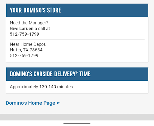 Take the most recent order for example. Placed delivery order at 12:12pm with a delivery time between 1:12pm and 1:28pm. Called to check on the order around 1:45pm (already 30 minutes late). After being on hold for 10 mins I was told that my order was scheduled to go out around 30 minutes later. So I waited. 45 minutes later when the order still hadnāt arrived and there was still no update on the pizza tracker I called and was put on hold for 10 minutes yet again. So now weāre over an hour late on the delivery. The kicker here is our order came out the oven at 12:42pm according to their pizza tracker. (Quality control check by Rick) so the entire time our order has just been sitting under warmers at the store. So much for fresh food. Who wants pizza and wings that have been chilling under a warmer?