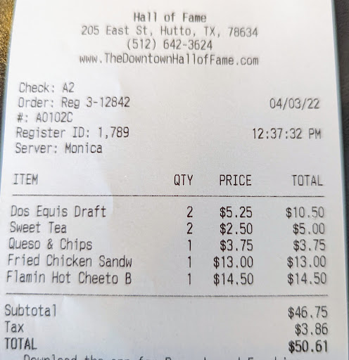 Ā Ā Ā Read moreMy husband and I went to HoF for a date night. We chose a booth in the dining room where 2 other parties were also seated. We ordered fried pickles as an appetizer. Several minutes later, and before we received our pickles, the waitress rerurned to take the rest of our order. We each ordered a burger. My husband requested no onions, and I requested no tomatoes. A few more minutes passed and our pickles arrived. I don't have exact times for the interactions so far because up to this point, nothing had taken overly long. The app took a bit longer than expected, but nothing to be alarmed about. Forty-five minutes after we placed our burger order, the waitress returned to tell us there had been a mix-up and our order had been given to someone else. She assured us that our food would be right out. Twenty minutes later, she brought our burgers. My husband asked whether there were onions on his burger before he picked it up. She said that she had asked the cook specifically. She had been assured there were no onions, and that she would throttle said cook if there were. As we ate, my husband transferred a handful of onion pieces to his napkin. The waitress did not return during our meal to ask how things were. When we were finished and she did return, he showed her the napkin of onions and she offered to take his burger off our tab and to give us a dessert because of the long wait. We ordered the brownie sundae, which arrived quickly. The brownie was dry and slightly burned on the bottom, which was exactly what I expected by this point. I give 2 stars because, despite the slow service and the unwanted onions, the burgers were very tasty. This was our first, and will be our only, visit to The Downtown...