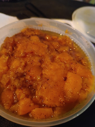 I had the short ribs with cabbage and macaroni and cheese and I got a catfish dinner with corn and candied sweet potatoes To take home. All meals come with two sides and a corn muffin. All of the food was quite spicy in my opinion. I’m a little older than most of the customers and older people have sensitive pallets. So, it might not be spicy to others, but it was certainly spicy to me. The macaroni and cheese had red pepper in it I believe, because it was spicy, too. The cabbage was spicy. The sweet potatoes were so-so, because I think he might have used corn syrup in the sweet potatoes. I cook, so I’m a harsh critic. The catfish was delicious, because I talked to the owner and he rinsed the catfish before he fried it, so it wasn’t so spicy. All of the entrees were generous. I don’t know if he always does this, but he gave me three whole fillets of catfish. There were a lot of short ribs, but they were cut very thin. The fried corn had green peppers and onions in it, but, it was pretty good and it was not spicy, because it was sweet corn. All of the food comes in to go containers. They don’t give you plates or silverware, you get plastic forks, and the food comes in plastic containers. Another thing, he was running out of everything! He didn’t have any dessert, no peach cobbler and we had to wait 30 minutes on the short ribs and we went at 5:00 PM. I can understand though. He doesn’t want to throw away food as expensive as everything is now.