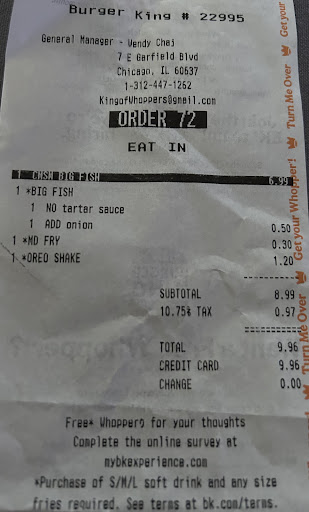 Read moreLove, love, love Burger King! My first time at this location and it was something else! Upon entry, the first thing we notice is that the counter is entirely encased behind and under glass and metal! WHAT IN JESUS' NAME?? Then, we see that the women's restroom had an "out-of-order" sign on the door and there is a waste can where the soda machine would usually sit. My friend ordered a double Whopper meal and I ordered a Whopper w/cheese meal. Not prior to nor after placing our orders were we told they had no lettuce. They also had no ketchup packets and couldn't put it in a cup for us as you can at other BK's. We heard from the cashier after we'd sat down and had begun eating our food when another customer began to place their order that they were out of lettuce. WTH? And, heard it again when another customer walked in minutes later and asked for tacos. The tacos BTW came with a slice of cheese rather than shredded cheese. Again, WTH?? Turns out the women's room wasn't out-of-order as a customer walked in needing it for her "dancing" child. She was prepared to use the Men's room upon seeing the sign but they buzzed the women's room for them to use instead. Additionally, we were quite entertained by the locals as we waited for and ate our food. Some were allowed to charge and/or talk on their cell phones, sell their merchandise or were just being a nuisance none of whom appeared to...