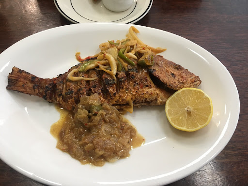 Hubby and I pulled all the stops and ordered a cup each of the Gingembe juice, fataya salmon patties as an appetizer, I had grilled red snapper that was served with caramelized onions, my husband had the Yassa Shrimp served with the caramelized onions and rice, and we shared sides of aloco (fried plantains), atieke, and cabbage with carrots. Needless to say, with so much beautiful and delicious food, it was a meal fit for a King and a Queen and we ate like such, with food left to go!