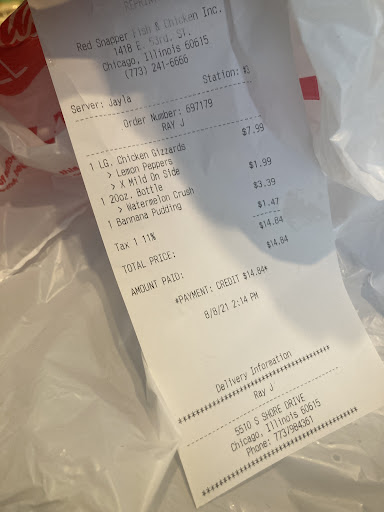 Read moreThis is the worst food establishment I’ve ever encountered over the counter and delivery. I order a large gizzard dinner with mild sauce on it and lemon pepper and extra mild sauce on the side. I also ordered and liter pop with banana pudding. The dinner had only lemon pepper and extra lemon pepper at that and no mild sauce to go with it. They also gave me no napkins or spoon/fork to eat my pudding with. On top of all of that, it took the order almost 45mins to an hour to be delivered to me. The food was cold and dry. Last the delivery guy had the worst customer service that I’ve ever encountered. I highly recommend that you get you food from anywhere else but there. I wish there was a 0 stars button because that’s what this establishment would have received. PLEASE EVERYONE, SAVE YOUR MONEY BUY NOT SPENDING IT WITH RED SNAPPER ON 53rd and Dorchester. Just awful. They need to go out of business immediately. Just poor service from the minute I made the call to place an order. TERRIBLE JOB!!! I hope your management sees the work its workers...