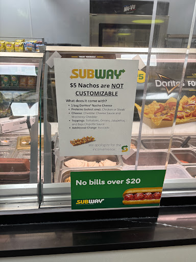 Read moreIf I could give it -100 I would the man who works the night shift is extremely rude. He yelled at me and my partner when we asked for lettuce on our nachos. We came a couple day earlier and the owner let us get lettuce, so we were confused why it was suddenly a problem. He was on the phone and was barely gave us any toppings. Theyâre the only subway that doesnât let you customize the nachos. Literally go...