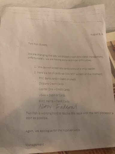**9.23.21 visit below Space and food are good but the inconsistency in service concerns me. As a small business owner in the Bronzeville area and a 20 yr veteran in the hospitality industry, I thought it impractical and poor business etiquette for the host to tell me they weren't seating anymore at 7pm, when the establishment doesn't close til 8. I can understand if I walked in at 745, of course usher me to carry out, however a full hour. Luckily my party had just arrived and sat 2 mins earlier. However when I arrived at the table I was told that the server insisted they order now and that they order for me, luckily I was ok with their selections. We were meeting there at 7 and no one was late or delayed. I'm confused as to why we were rushed and the food literally appeared at the table at 709. Being that we ordered the special and I would've liked to have ordered additional items but wasn't given the opportunity. The staff was not rude, just misguided it seemed. I would think as a restaurant owner, where food is a complete loss if not sold, that the staff would be encouraged to upsell apps, add ons, and remain open for dine in guests til close (and as a server with a built in gratuity, that's a no brainer...the more guests the more money). This is not a bad review, it is an observation on how guests can be turned off when they are turned away prematurely or underwhelmed by a dining experience. Because I've managed restaurants in Chicago and Las Vegas I am never opposed to tipping wait staff or a take out person, but I do not feel as though I received a proper 2 fish experience. I could've just took it to go and called it. But as a Black business owner and consumer, we must support and relay observances...