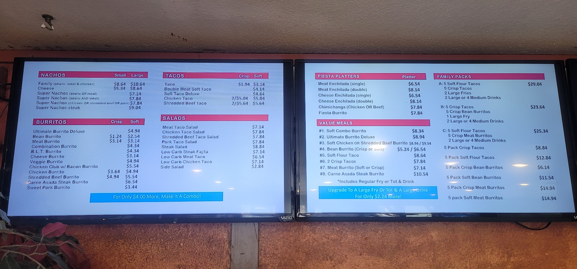 Read moreMy coworkers and I have gone to this establishment for lunch many times, however today was one of the worst experiences I have had here. I placed my order at the drive through, two of the items did not get ordered right at the beginning, and I had to re-order those at the window. After a very long wait I was told they were out of nachos and had to cancel that order, I ordered a replacement meal for that and continued to wait. When I was given the order the two large cheddar tots I had to re-order at the window were not present, I asked where they were and the window attendant looked very confused and took it back... I waited again, was presented with a drink I didn't order, and by the time half an hour had nearly passed my order was presented again. I took the (I assume) managers word that she doubled checked everything, and her apology, and left. No big deal. When I got back to work the order was poorly, POORLY, put together - tacos had nothing but lettuce, combo burrito was nothing but beans, and not to special order and requested, and was missing the other order I had given to replace the nachos... I don't often write reviews because I understand every place has an off day, but today was pretty bad. I do not think I will return to...