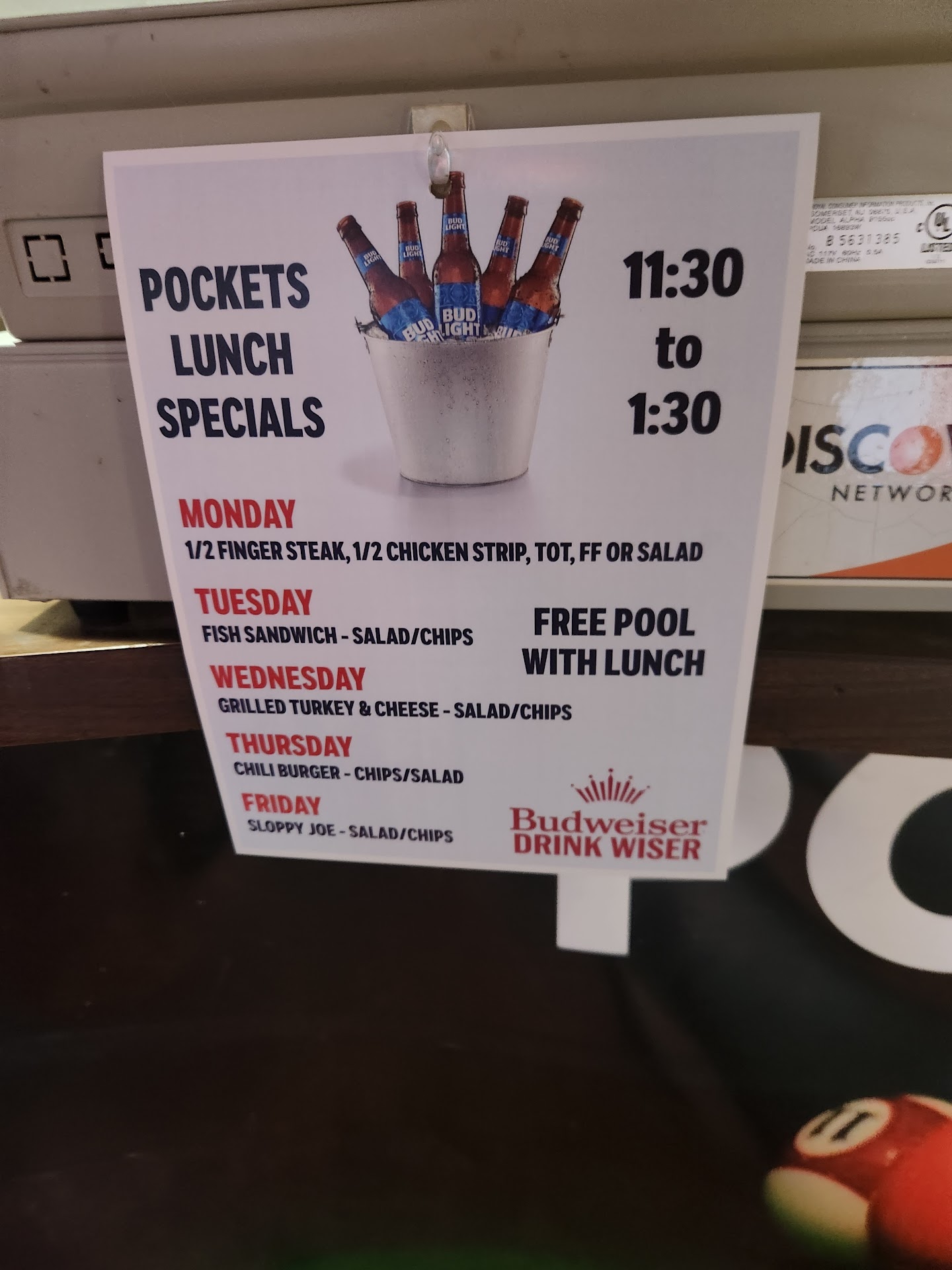 Read moreHere's everything you need to know about the place: Staff is very proffesional, atmosphere is always great. This is my home away from home. They have 8 foot (green) and 9 foot tables (blue), both are $7 / hour for more than one person. If it's just you playing it's $3 / hr. Veteran discounts are available - With Veteran ID. There's also quarter tables on the right side, and those are $1 / game. People under 15 years of age are allowed (WITH A PERSON 21 YRS OF AGE ACCOMPANYING THEM) until 5:00. After 5, you must have an I.D. proving you're 16 or older, and that you have a 21 yr old with you. At 8:30, it's a bar, you must be 21 to be there. Every Sunday night at 9 is kareoke, and every first Monday of the month is DJ Bingo. Attached is a photo of the lunch specials, which are all awesome. There is also a $5 monthly wine tasting but the days vary by month, so ask a bartender for details on that.