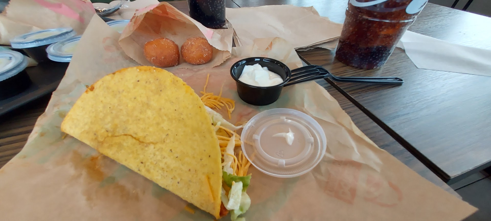 We went through the drive-thru and ordered 7 crunchy tacos and 1 order of nachos. We always park in the lot and eat there since we live outside of IF, so our food would be ice cold by the time we got it home.