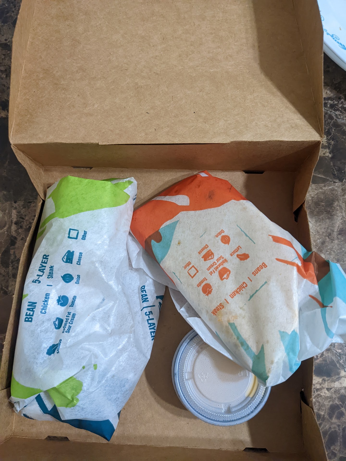 Read moreSo I ordered delivery from door dash for a quick dinner for the husband and I. Spent around $40 in food. Long story short I wanted to try the ranchero crispy chicken burrito. We get our order, and pull out the burrito and instantly knew something was wrong. The burrito wasn’t wrapped properly so I open it up and the chicken is hard as a rock, gray brown and cold. I tried taking a bite from the chicken and it was hard as a rock and didn’t taste fresh at all. Instantly bagged up the food and drove to Taco Bell. I asked for the manager on shift. The guy wasn't wearing a name tag, so I didn’t catch his name. I explain to him that the chicken was old. Pulled it out and showed him the gray brown chicken in the burrito. He proceeded to tell me that there wasn't anything wrong with the chicken and asked if I wanted a new burrito. I said yes and asked if I could see the “fresh” chicken. He goes over to pull out a fresh chicken strip and it actually looked fresh. And I had him compare the chicken. He instantly got mad when he realized that he was wrong. He tried to get another employee to to remake my burrito, but she told him he had gloves on that he should do it. He remakes it the burrito and bagged it, threw it on the counter and walked off. No apology, no direction to do with the old burrito. I asked the lobby girl what I should do and she said throw it away. So I did. All I wanted was something edible to eat. Not arguing or attitude. A simple sorry would have made the experience fine. I get that stuff happens, but If your going to be a manager in a business, act...