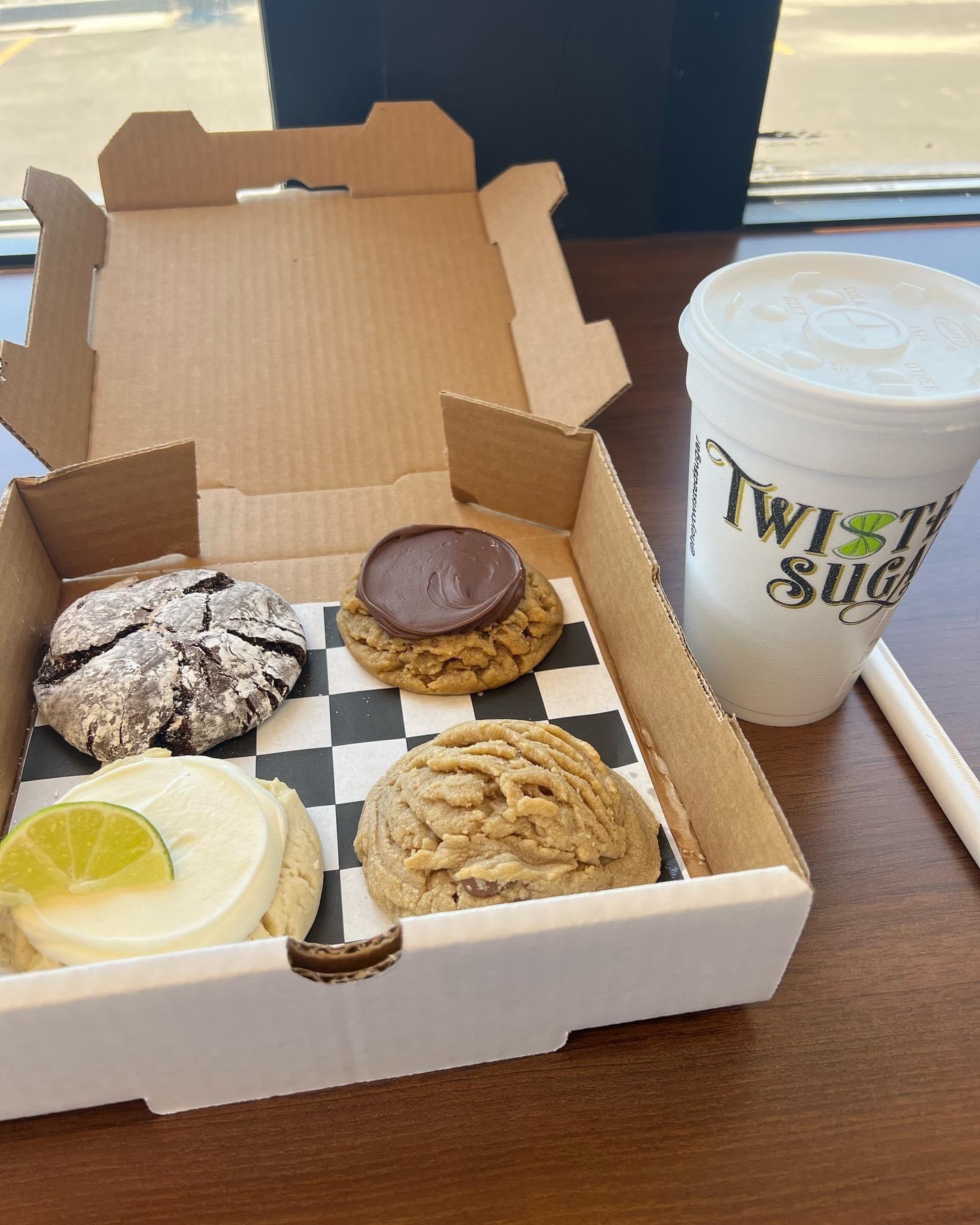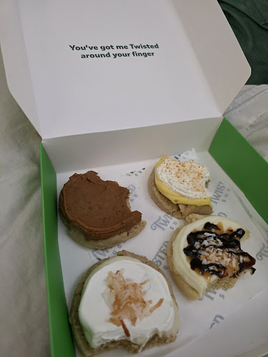 Read moreI visited location as my first to any location. I do not like most cookie shops, as they seem to double (or worse) the amount of sugar in all cookies. So I was hopeful but not sure. After seeing some reviews that seemed to suggest Twisted Sugar would NOT be sugar bombs, I ordered 4 cookies--Chocolate Chip, Crinkle, Lemon Tart, and Lemon Raspberry. I was a little surprised by the texture of the cookies. They seemed barely baked, maybe even almost doughy. But I liked it! My favorite-- and I LOVED IT--was the Lemon Tart. I also really liked the Lemon Raspberry. They actually have good citrus flavor. If you like just a hint, they may not be for you. I often put lemon or lime powder on top of whatever lemon or lime treat I get, but none (or no more, in the Tart case) was needed here! The Crinkle was ok, just not my thing I guess. I didn't care much for the chocolate chip. I don't think it was quite as sweet as most shops', but the underbaked texture and lack of sugar caramelization just wasn't for me. I love cc cookie dough, so I don't know. Anyway, I WILL be back!! I shared all of the cookies with my family, which was hard because I was on a "Not-A-Mom" weekend, so had to save them until I got back home the next day. I want my OWN now! 😆 Oh, that brings up a great note: even a few DAYS later, the remaining cookie bites weren't dried out and crumbling. They were a bit drier than fresh of course, but...