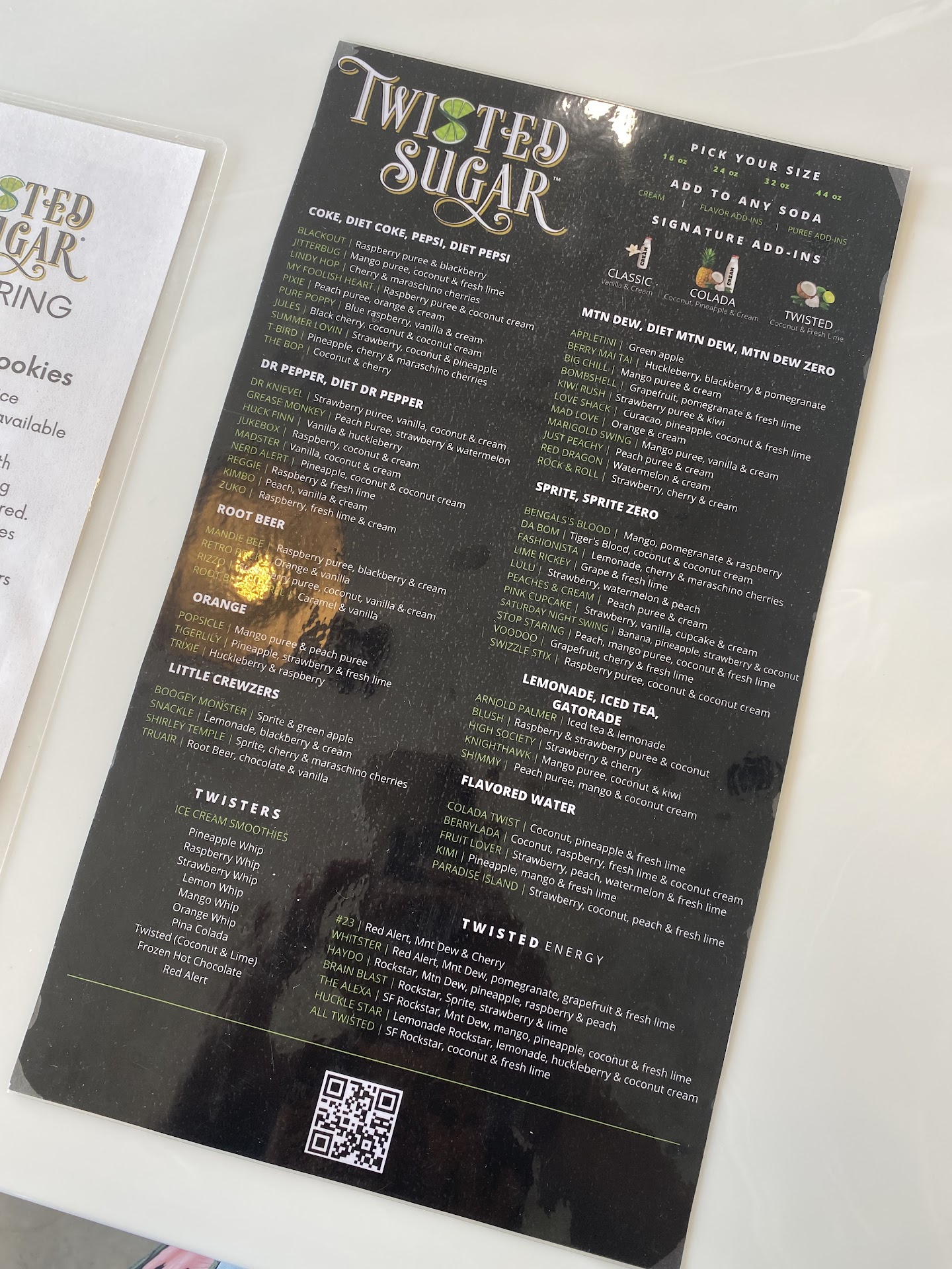 Twisted Sugar has officially entered the soda-shop game in Idaho Falls. They have a well-thought-out drink menu that features over 50+ options, not including your own combinations. I look forward to visiting again soon to try one of the Twisters (Ice Cream Smoothies). The Pineapple Whip Twister sounds delicious. I tried the Peaches & Cream with a Sprite base. It was good but I wish the peach flavor would come through a bit more.