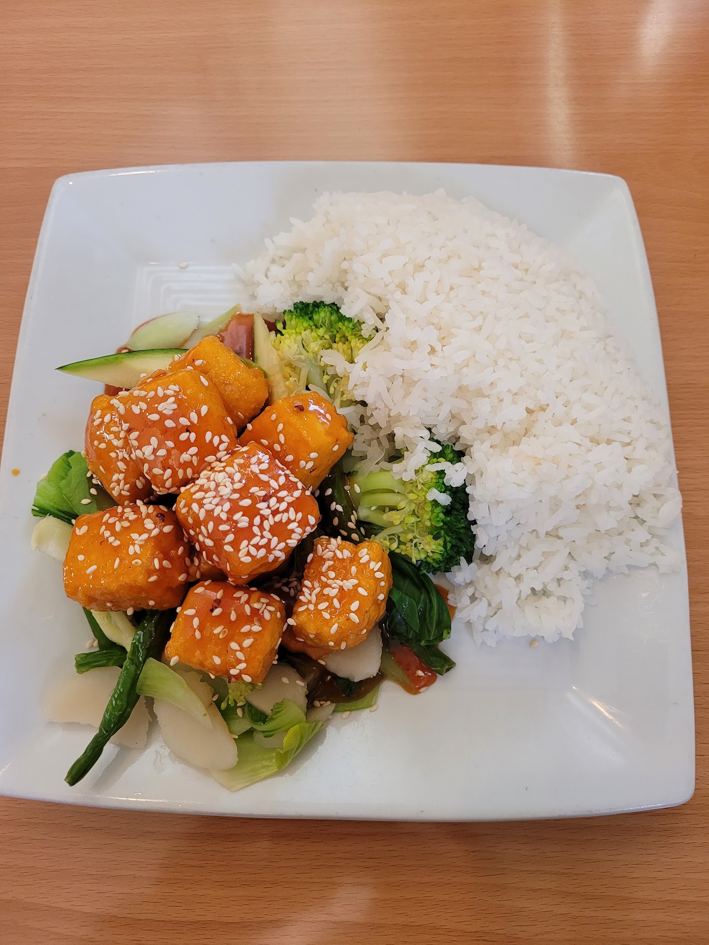 I had been wanting to try Eric's Asian Cafe for a while now. Idaho Springs Safeway is the closest chain supermarket to where I live in Gilpin County, so I pass by Eric's a couple of times a month. I finally made the effort to go there for lunch yesterday. The food was DELICIOUS! I had one of their lunch specials which included sesame tofu w/ white rice and egg rolls. The egg rolls arrived first and were piping hot and super delicious, qty of 2 comes with the lunch special. Then came the sesame tofu - see the perfectly sized lunch portion picture. It had a bit more vinegar and the tofu cubes a bit softer than I'm used to from other restaurants for this dish, but it was still very tasty - I liked the extra tang and the softer texture did not bother me at all! The tofu came on a bed of freshly steamed veggies - they still had a slight crispness to them, so definitely not over steamed. I can't even explain just how fresh the vegetables were - I was pleasantly surprised! There was more of the wonderful sauce "under" the vegetables, so the only thing that came coated in the sauce was the tofu - great presentation and allowed me to mix the veggies in as much or as little sauce as I wanted. White rice is white rice, but it complimented the plate well! Since I only had water to drink, my bill total was under $10!!!
