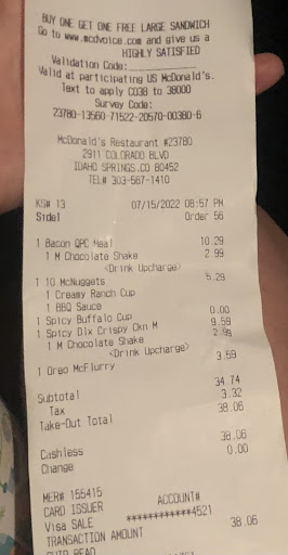 Read moreWe stopped in Idaho Springs about 9:55pm last night, October 14th to get a bite to eat. We waited in line at the drive thru for about 10 minutes (at least) and was never acknowledged so we pulled up to the window and again waited for some time to be acknowledged. When we finally were, we placed our order and the guy was really inconvenienced by the fact that I asked for a small cone. He probably thought that we couldn't hear him, or maybe he did it on purpose but he loudly said Why? Just because I wanted a cone. When we were being handed our meal, we first got our drinks, we ordered two Sprites and first thing we noticed was that they had no ice, I didn't care by this point, just wanted to get our food so we can get back on our way home. Our cheeseburgers weren't wrapped correctly, about a 1/4 of it wasn't even covered. I picked up the 2nd burger and it was the same way. We just laughed it off. I put the fries in the middle of myself and the driver so we could share and low and behold, they were cold, needless to say we couldn't eat them they were so gross. Next onto our nuggets.. the driver and I were sharing them, we both only ate 1 each because they were so cold and shriveled up that they were disgusting! My granddaughter also ordered nuggets and ate 2 out of the 10 pieces for the same reason, cold, shriveled up and disgusting!