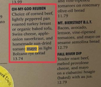 Turns out it was right there on the menu: THEY MAKE THEIR REUBENS WITH MAYO. I'm all for fresh takes on food, but this doesn't qualify. If you're going to call a sandwich a Reuben, that name comes with a really specific expectation, and you should at least have a bottle of Russian dressing (or French, 1000 Island, etc.) somewhere on the premises.