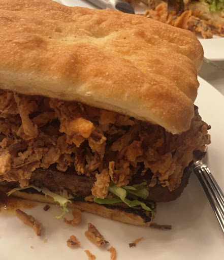 The brunch menu was sort of boring. It is your typical brunch fare with little imagination. I wasn’t moved particularly by any of the brunch items that were listed. I ultimately settled on the meatloaf sandwich as it at least sounded like something different to try. I don’t see meatloaf sandwiches on menus very often. It was ok. It tasted alright. It’s a very tall sandwich so I opted to eat it with a knife and fork, as I try not to unhinge my jaw in public until after 11 pm. The description of the sandwich seemed to really be patting itself on the back but frankly, with no side, it’s really just kind of boring and covered in an immense amount of French fried onions. It will not give you any feeling of nostalgia and I would venture many of you would find it doesn’t hold up to your mother’s or grandmother’s meatloaf recipe.
