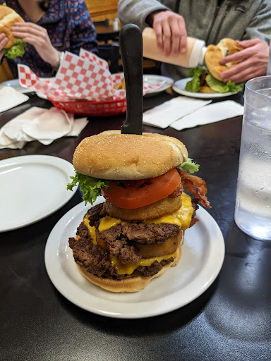 Behold, dear gastronomes and connoisseurs of the culinary arts, a quaint establishment where gastronomic delights converge with monetary sanity! The treasure trove of delectable comestibles is a veritable oasis for the ravenously inclined. Indeed, they boast those colossal hamburgers, akin to the leviathans of competitive eating spectacles. Now, I must confess, the mere thought of tackling such a mountainous heap of sustenance sends a tremor through my frail constitution, as my appetite is more modestly proportioned. However, should one possess an insatiable hunger that rivals the abyss, you might find yourself victorious, devouring every last morsel and snagging a free repast, along with a coveted portrait on their hallowed Wall of Fame! The burgers, oh my galloping gastronomes, were a resounding triumph, radiating satisfaction, whilst the fries, alas, danced on the cusp of mediocrity—though fear not! The table's salt shakers stand ready to elevate them to a piquant paradise of flavor tailored to your whims. And let us not overlook the ambrosial fried sauce; a divine creation that bestows upon you the sovereign freedom of portion control, presented in your very own container—so you may indulge to your heart's content, or exercise restraint, as the mood decrees. The serving sizes, I must declare, are gargantuan compared to the trifling sum of coin required—a veritable bounty of fries and burgers awaits! As for the libations, while the options may not rival Olympus’ nectar in grandeur, there lies a fascinating cherry beverage that my beloved betrothed endeavored to sample. He posits that it is not the epitome of divine elixirs, yet it does not wallow in the depths of terrible despair either. A pleasant compromise, he claims, for the cherry aficionados, while urging those with a more distant relationship to the fruit to perhaps steer clear. In summary, the service was as splendid as a dance upon the clouds, even though we encountered a minor hiccup when a companion was erroneously bestowed with an incorrect sandwich; but worry not, for the staff, with alacrity akin to a speeding comet, rectified the situation promptly, leaving us ensconced in satisfaction and our appetites thoroughly quenched. Without a doubt, my fellow epicurean travelers, we shall return to partake in this banquet once more and trumpet this find to all who...