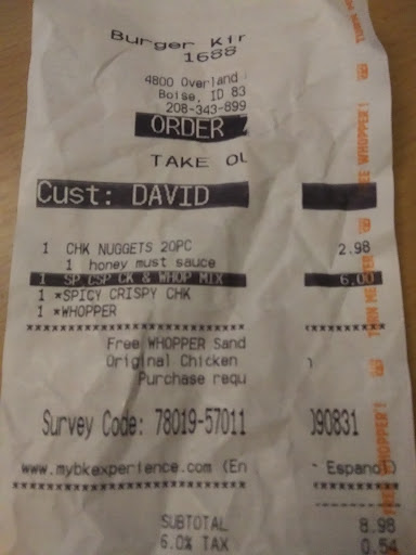 Read moreIn reality I wouldn't even give them 1 star. This place is a JOKE! We pulled up to drive thru and was told.. be with u in a min. SEVERAL minutes later we said hello and was reaponded with, sorry about that what can i get u. So i place my order. 2 whoppers and a jr bacon cheeseburger. Get up to window and pay. Sat for another 3-5 mintues waiting for food. Finally get the food and start to leave and realize she didnt give me my reciept.( So it is their policy if no reciept given then food is free. ) i go inside and the manager wouldnt give me my money back and asked what i wanted... maybe some free cookies. So i take cookies and go home. Get home and one whopper is smashed with pickles on outside of bun, 2nd whopper has brown and wilted lettuce, jr bacon cheeseburger had NO BURGER. Drove all the way back and was greeted with what would u like me to do about it from the manager. Working in retail myself she never should have never asked me what i wanted and just automatically apologized and refunded money and offered to remake.WILL NEVER GO BACK to this place!!! Ridiculous!!! I went to Wendy's instead and it was WAY BETTER!! And the girl at wendy drive thru said she had same problem with this joint and wont go...