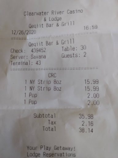 Read moreStayed the weekend at the casino and decided to have a nice dinner at the restaurant.. The server was nice friendly and helpful and did a good job.. The 8oz New York strip steak however is not so good , it tasted a little off and was tough and had gristle running through the whole thing so bad that a good portion of the steak was inedabl.. Very disappointing when you spend a large amount of money at a place...