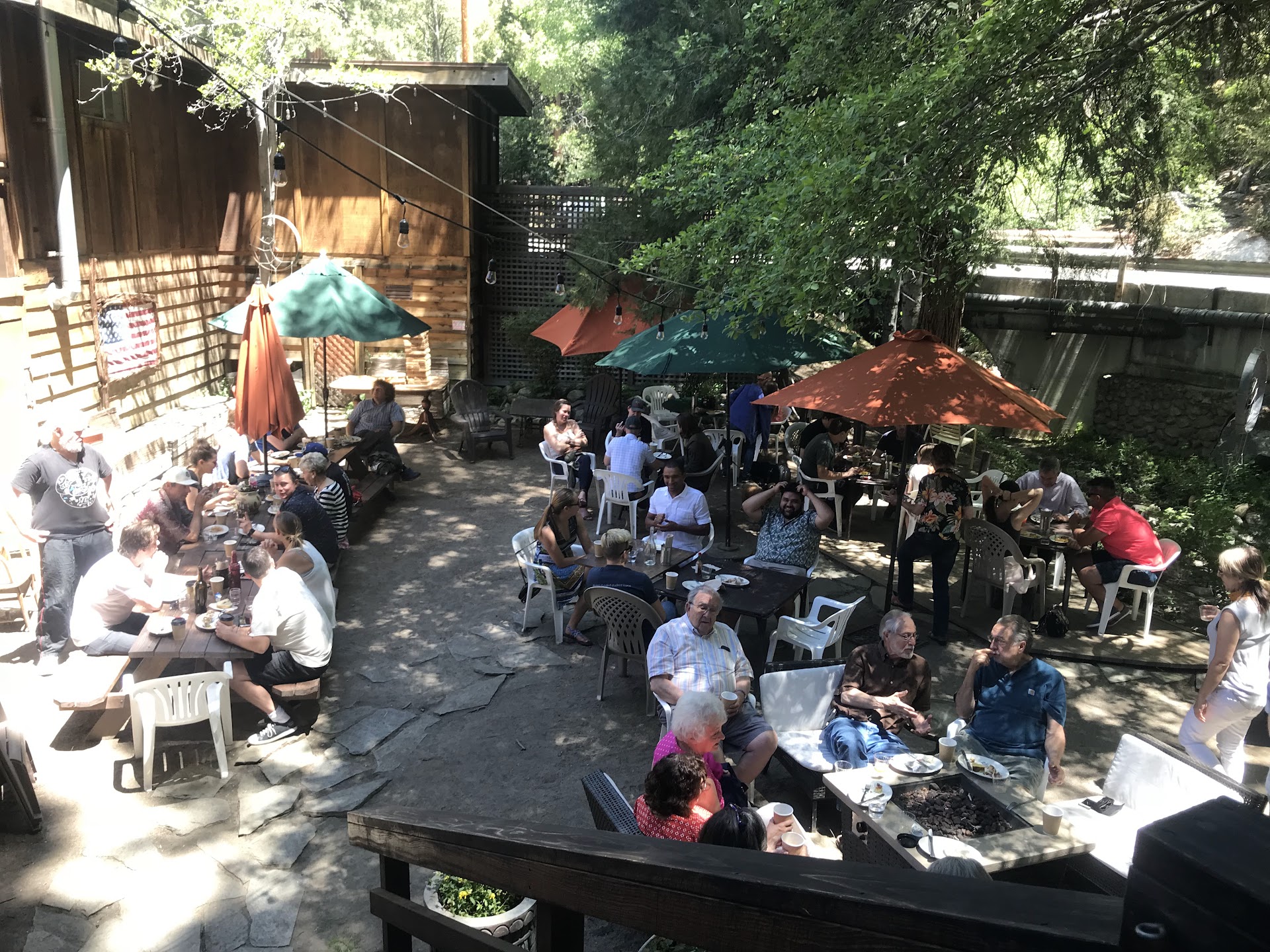 Read moreInteresting little mountain establishment. The background music was nice, as was the big fireplace, dark wood paneling, worn leather couches by the fireplace, and big outdoor deck in the shade of the pines. I hoped the food would be as comforting as the “homey” interior, but although I think they try, it wasn’t really very good. We each had a Bloody Mary (half price on Sunday), and while it was served in mason jar stemware (funky and somewhat cool), and heavily garnished (asparagus, olive, pearl onion, jalepeno, and bacon), it was heavily laden with Liquid Smoke, and not at all to my liking. (Even in recipes, Liquid Smoke should only ever be used VERY lightly, in my opinion.) Our food order included Armadillo Eggs, which were described as having all sorts of ingredients, but they were basically fried cheese balls. The Sweet Corn Cake dish topped with tomatillo sauce and eggs was good, but not great. (The corn cakes resembled mushy pancakes, but did have a nice flavor.) We plan to return, but will definitely try different menu items. The place has a chill vibe that we loved, so we would give it four stars if the food quality was better....