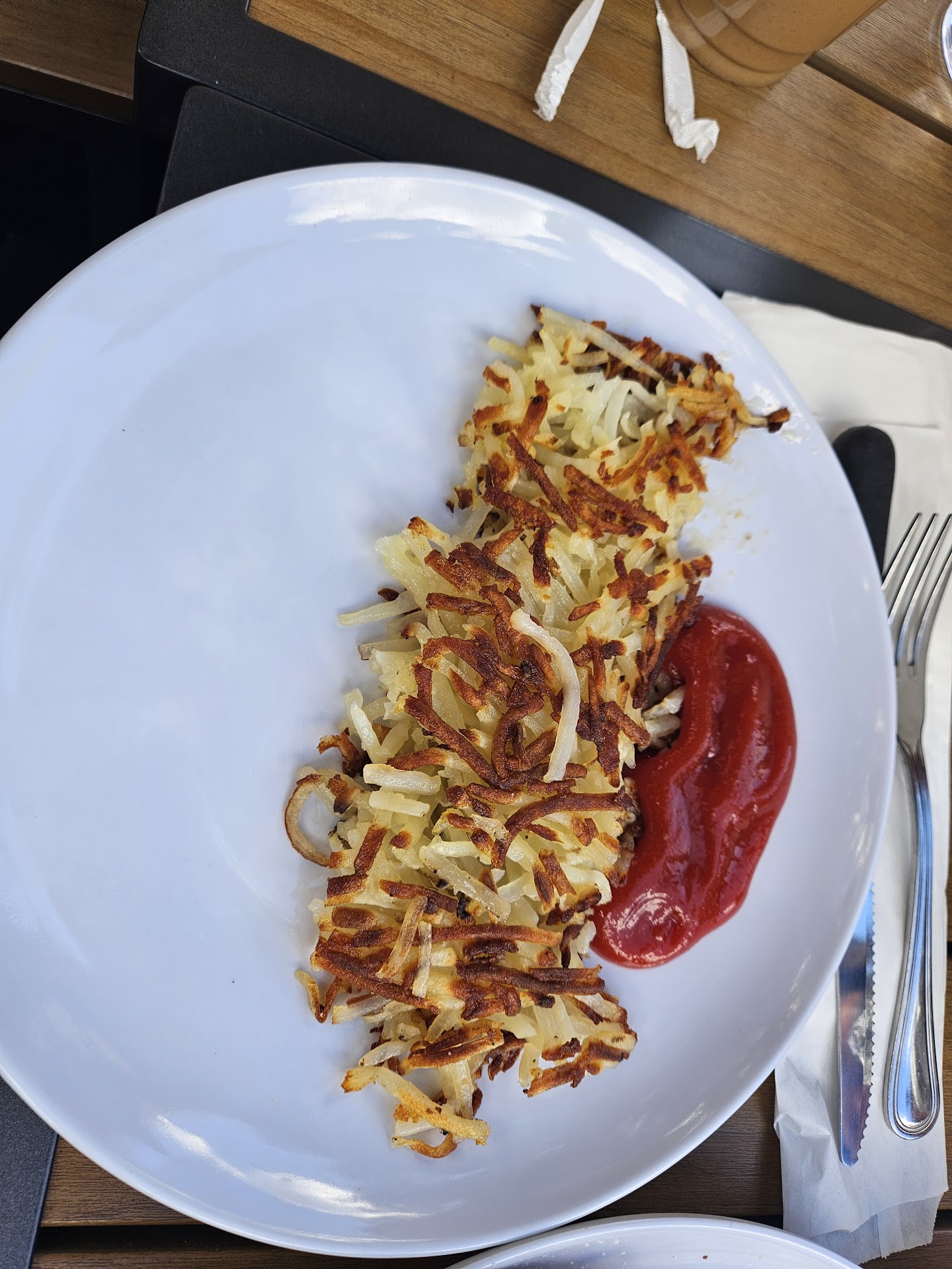 You give your order at the counter, pay, and then your order is brought to you. Other than that, no other service is provided. There is a self-serve station before the outdoor seating, but as this looks like a wait staff station, it can be overlooked. As this was my first experience at this restaurant, I did not realize we were expected to gather courtesy water cups, jelly, extra napkins, etc. until we had pushed four rows into the crowd and settled in at a table against the rail separating the restaurant from the sidewalk. The 2 drinks ordered came up first, then 3 separate trips for the entrees. My waffle, hashbrowns, sausage, & eggs were warm, not hot, but the waffle, served with one pat of butter, was delicious even before I added the syrup. The large 3 sausages were flavorful & I shared those & the hashbrowns with the others. The eggs ordered hard were just a bit runny in the middle. Overall, it was a good experience. Portions were decent-sized, fresh, and mildly seasoned. Tourist priced, which included tip just for 1 meal only: $25.42, which consisted of a waffle, 3 eggs, 3 sausages, and a side of hashbrowns. See the...