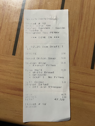 I have been going here for years with my friends from Saddlebrook Farms. Usually the service was pretty good. The food is hit and miss. But tonight was outrageously bad. We had a reservation at 5 PM for 7 people, but no one was working to seat us. So after waiting awhile to took a table in the corner. A man I think was one of the owners asked if we were the reservation, and we told him we were. Then we waited and waited. I had to flag down someone to get the menus. Finally our waitress came and took our drink order. Her name is Morgan. We asked for separate checks. She took the meal order and that was it. When we got our checks there was an addition of $7 as a tip. That was fine for my check as my husband and I had a bill of over $40. But one of our guys was single and had a bill of only $14. He also had a tip added of $7. When he asked about it Morgan said it is on the menu that because we asked for separate checks there was a charge of $7 per check. I never saw that on the menu, and like I said we have been going there for years. Well let me tell you we are not going back any more. That was something we all agreed on. Big mistake Crossroads, you just lost some...