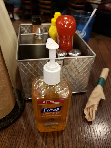 My picture submitted is a big issue. This has to be a health code violation. No way does hand sanitizer belong in a condiment box. The bottle says Purell but that is NOT Purely. If a representative from Purell were to eat here they would have a serious problem with this. The pump appears to have dried catchup on it and the sanitizer is red like ketchup got inside it. Explain what would happen if a small child grabbed this and put it on their food? I feel like this is also a health code violation. Take those disgusting bottles...