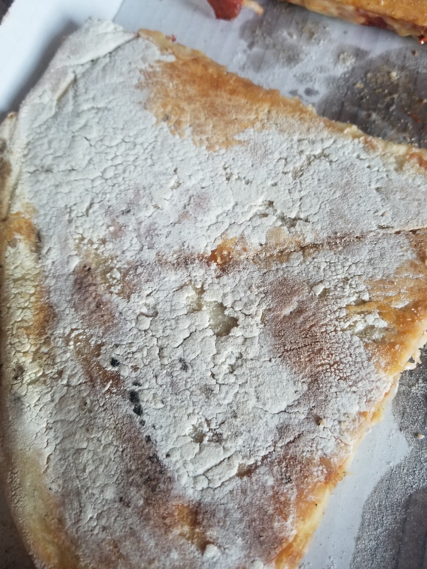 Here are some pictures of the crappy pizza that my wife just ordered. The whole bottom of the pizza is covered in flour. This pizza is awful. I warned her but she wanted to try it again. She finally said she's not ordering from there...