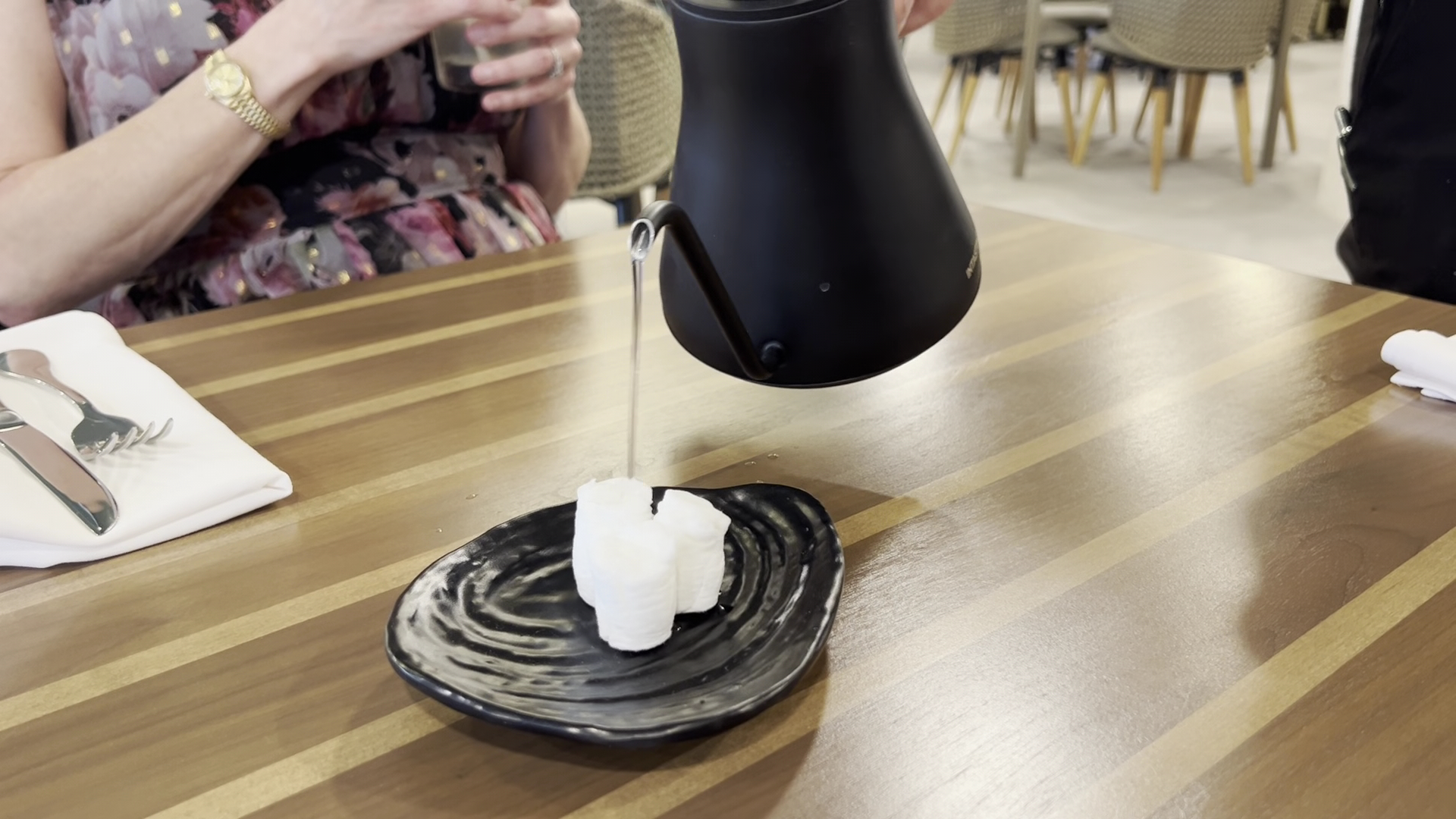 We chose Roppongi because we saw online they had sushi and we were craving sushi with a sunset view. We were seated, given menus, and hot hand towels. We ordered drinks, but even with the place being slow (maybe five tables total between both restaurants), it took almost 30 minutes to get them. The cocktails were NOT good. Both tasted flat and salty.