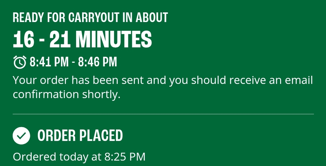 Read moreArrived on time for order at 8:42pm. Had to get employee's attention to notify them I was there to pick upWas told order would be ready in 5 minutes. Time frame for carry out was listed 8:41p-8:46p online when I placed the order. Received order at 9:14p (28 minutes passed time).