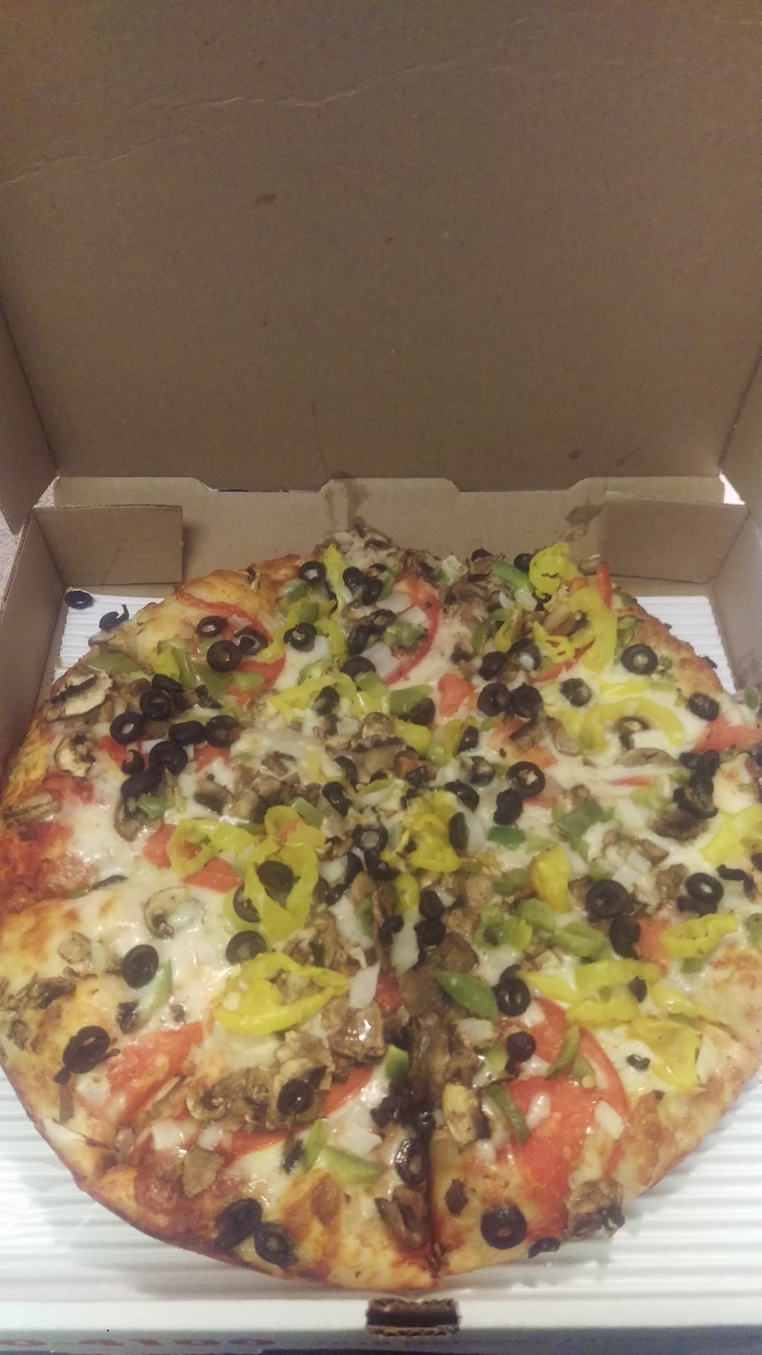1st review: Pizza was a good size for a large. Pizza dough was thick if you like lots of crust. Pizza sauce needs a dash of sugar it was quite acidic. Breadsticks were nice size and tasted great. Fish dinner might have been good but I think someone forgot it in the deep fryer, wayyy over cooked as well as the batter tasted like oil that needed...