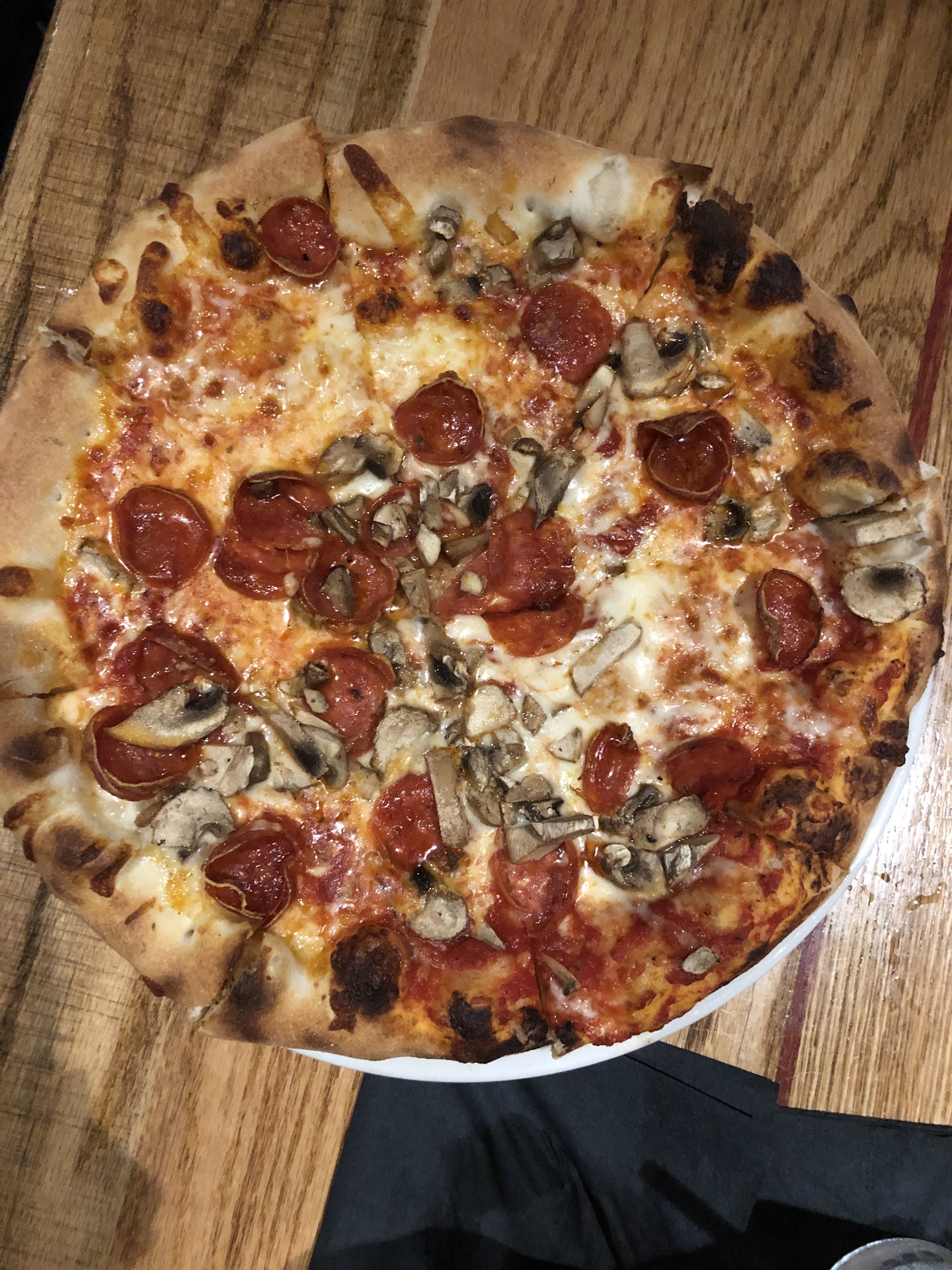 10” pepperoni and mushroom pizza very good. Would get it again. If you like garlic, ask for a side of the garlic pesto and dip your crust.