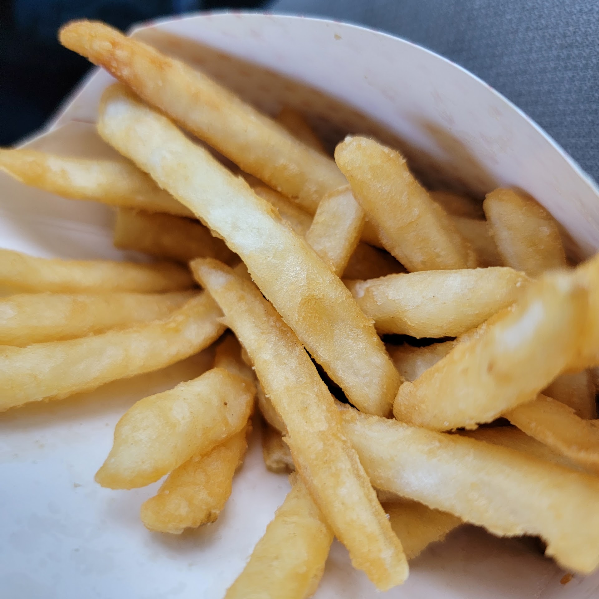 I really only have one critique and one complaint that brings the score down to 4 stars. The burger meat (while great quality, cooked well, and hot), was rather bland. The fries, however (while hot), tasted like they had been fried in old oil. This is a problem I've noticed at Burger King and Sonic some times as well. The fries will taste sort of off and I can only conclude it's from using old oil or not cleaning the fryer properly.