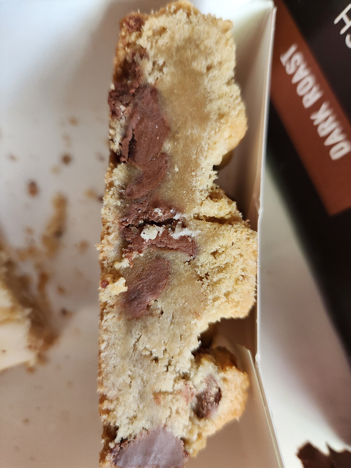The freebie was a chocolate chip - their signature cookie - that simply lacked in distinct flavor beyond being sweet. A handful of chocolate chips with a spoonful of sugar as a chaser would be the equivalent. Moreover, as the picture intends to indicate, it was undercooked.