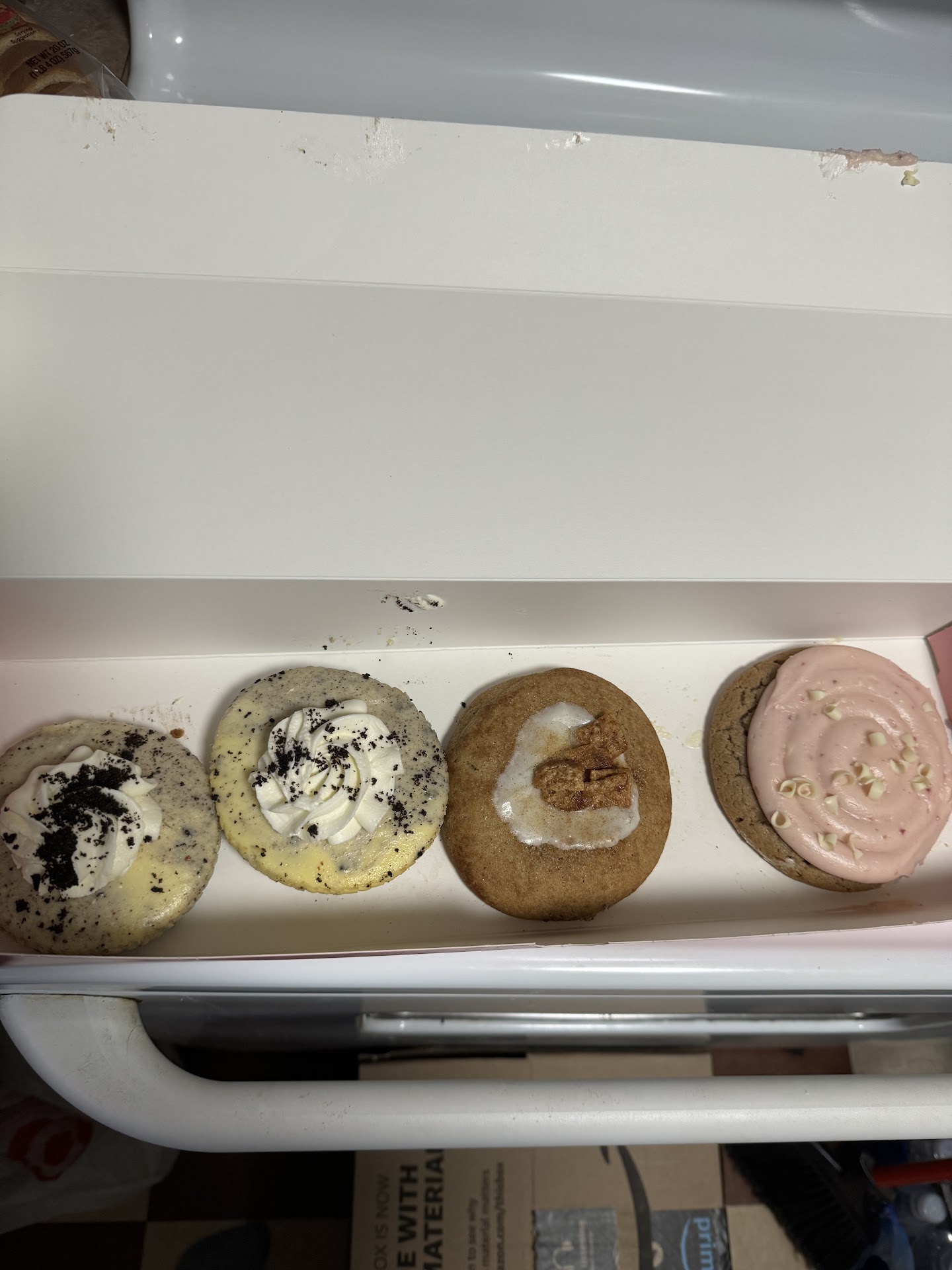 I keep trying to give this location a chance because it’s closer. But I will definitely be driving out of my way if I want a cookie to the Lee Summit location. I ordered 4 cookies, the Oreo cheesecake two of them which was an up charge of $1.25 each. And the cinnamon cookie and then a strawberry cookie. The strawberry cookie looked great. The cinnamon cookie barely had any icing on it if you could call it Icing it was so runny and thin it looked like water. The Oreo cheesecake cookies I should’ve looked at them closer for the two seconds she showed them before she closed the box. But when I open the box at home, the cookies did not look right. They definitely don’t look as advertised the cheesecake cookies were clumpy like it wasn’t mixed properly, some parts of it is the Oreo cheesecake mix and the other is just clumps of cream cheese. What a big disappointment and especially the Up charge of $1.25 each For cookies that aren’t even made right. The cinnamon cookie just looks like it wasn’t baked right Almost like when you put too much baking powder in the mix. I also found Two pieces of animal hair, one in the box and one on the cheesecake cookie. I Also saw somebody making some of the mix and they were just pouring whatever amount of it look like oil into the mix without measuring the amount they were putting in. Could be the reason why the cinnamon cookie didn’t look right if they’re not measuring the ingredients first. They didn’t seem to be too friendly there nobody greeted us and not even said one word except for the lady handing the cookies she just said here’s your cookies. But for $20 for 4 cookies for them to look the way they do in these pictures it’s a bit...
