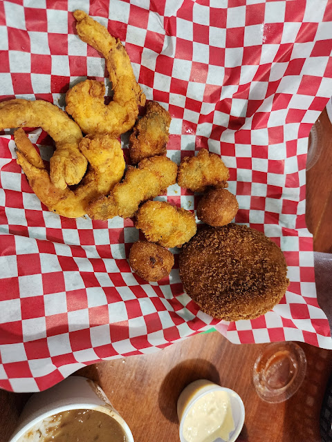 The place looked very low key and I was stopping in for a late lunch at 2pm so it was not busy when I arrived with only one other table with customers. Waitress was friendly and helpful. Ordered the 3 piece fried fish and 3 piece fried oysters with red beans and rice and green beans as sides. Service was fast