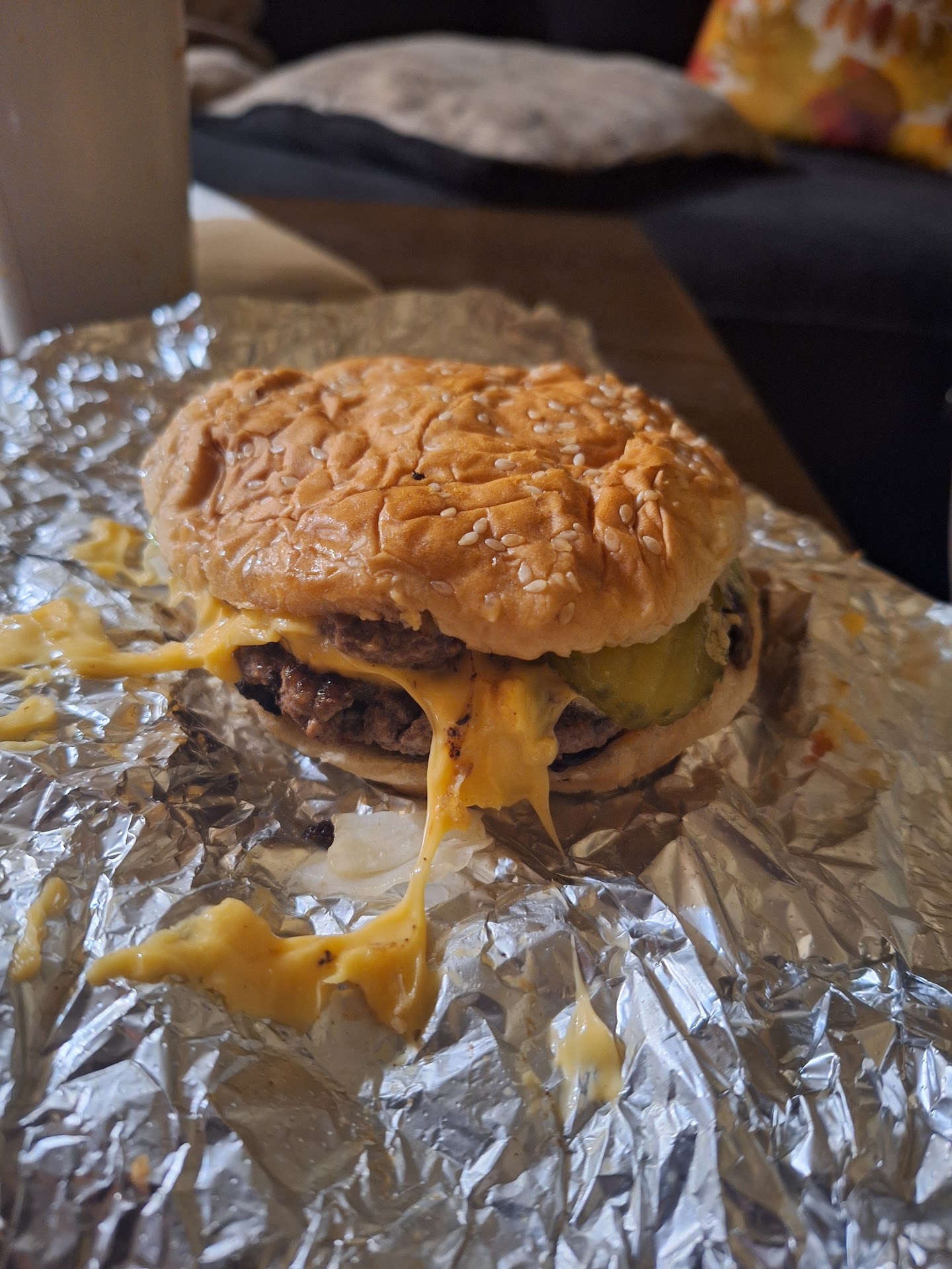 I got a triple burger with bacon and after adding the seasoning it was very good. I was not super stuffed like you would expect from a triple. Total price for 4 burgers 2 fries and 3 drinks was $60. (Yes I'm fat and had to order another burger)