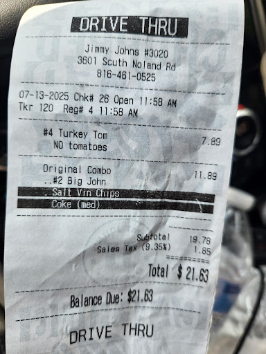 Well I pulled in the drive through 6 minutes before close. Waited 4 mins patiently until I was greeted and asked my order. So I place my order which was, 2 lulu's with cheese no tomatoes! ( cold sandwiches ) with the gentlemen, and its now currently 8:58pm 2 minutes before close. after ordering, I get turned away by the person saying my manager advised me that we're now closed. Which is odd, When you technically close at 9pm!!! and Ive been waiting in the drive through for for service for 6 mins... and it was a customer in the lobby also! So I called in to get the managers name and i feel like it was her that answered, because she paused when i asked her the managers name on duty. I was told by the lady on the phone the manager on duty name was Kat which I feel was a lie. Either way bad business jimmy johns and I definitely won't be coming back to your establishment to waste my gas, time or money since you all don't have the time or value your customers! Seeing that your employees had time to come to the front door both of them to open it to see if I was pulling off or around to the front instead of successfully do their jobs and make my sandwiches what...