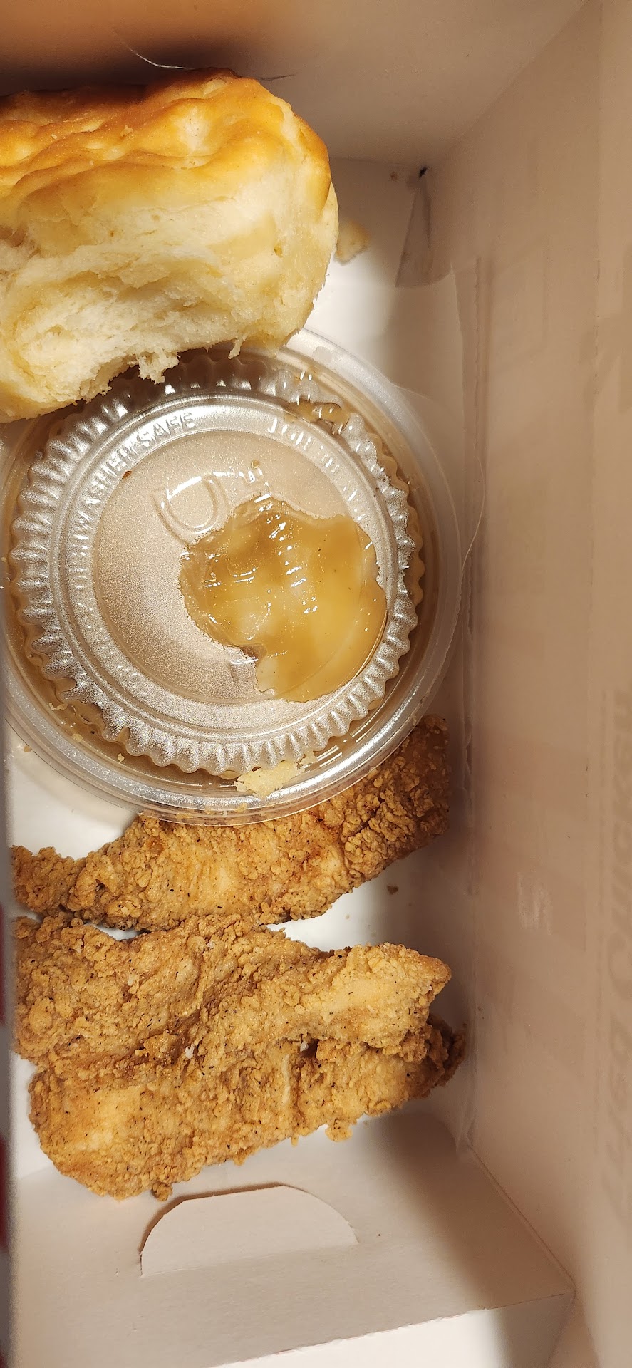 Read moreThis is the saddest chicken I've ever seen. They must be running low on tenders or something because these are so tiny. The cashier is not having a good time and has trouble listening to orders (likely because he's wearing an earphone). I asked for chicken and waffles, and the board says it comes with tenders. I asked for the tenders and waffles for my brother. I got a drumstick and thigh piece, neither of which he will eat because he's special needs. I also expected this to come with a drink, because I asked to make it a meal. That didn't happen. I also asked for a combo of 3 doritos loco supreme. I got the tacos, but not the drink. He must have not heard me, again, on account of the earphone in his ear. Finally, it was clear he didn't want to be there. I'm going to switch dinners with my brother, but I'm highly inconvenienced at the lack of basic customer service. If you don't like your job, then make room for someone who...