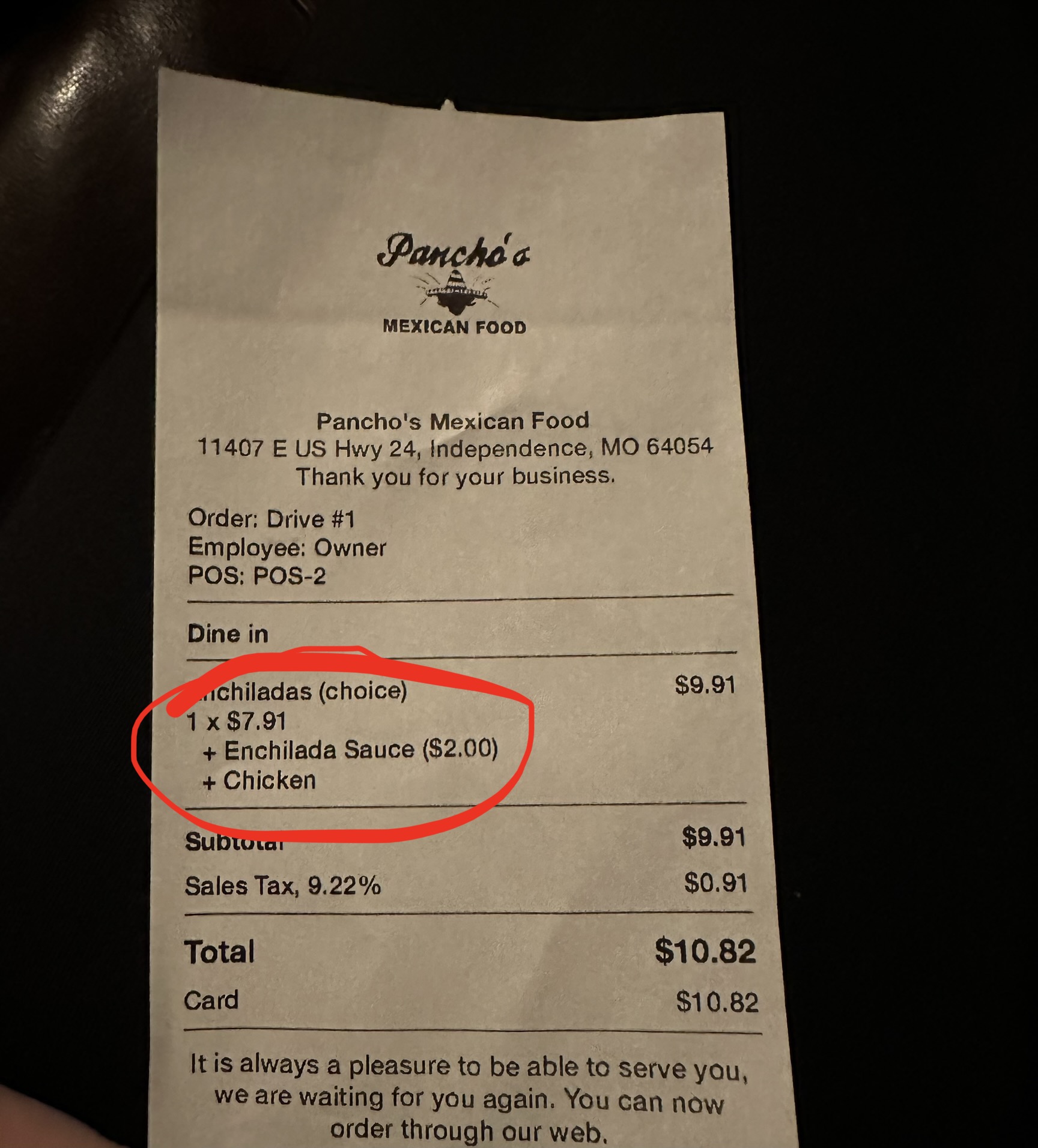 Read moreVery disappointed. So here's my dilemma. I do dashing on the side. And I get a lot of deliveries for panchos Mexican food. And often times on these orders, I notice a lot of one particular burrito, the California Burrito. It had me wanting to try it out for some time. Well this morning was just that time. I'm out dashing, I decide, I'm doing it, I'm getting this famous burrito. I look up panchos menu on Google maps. Because I couldn't seem to nail it down on Google search alone. Anyhow, on the menu I find it burrito listed for 7.99. Now I'm a penny pincher. The idea of spending over $8 was already weighing heavy on my mind. To be clear, I'm not knocking the price. It's just me personally that doesn't want to spend that much. But I was there, I was gonna see it thru. The guy working the window opens up and says, $10 and some change. I was like, what?! So I told him I seen the price for 7.99. He says, no. I then show him. He still says, no. I'm like bro, for real? You not got l gonna honor this price I'm showing you. He says no, that prob 3 years old. I'm like that's fine but this is what it says. He stays with no. Mind you, the burrito has probably already been made. And this same guy saw me dashing on 2 orders mere minutes ago. So I'm like, just forget it then. And he literally hands me my money back and says have a nice day. Idk, just kinda threw me for a loop. Basically I've never heard of a place that won't honor an advertised price. Old or not. And it was already made. And i dash for them all the time. Other than this one experience, I don't have anything bad to say about the joint.