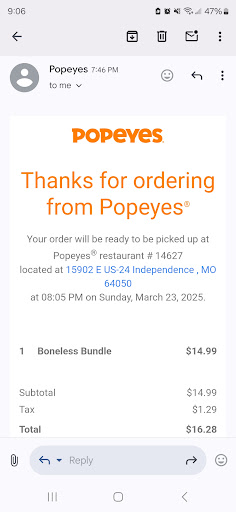 Ā Ā Ā Read moreNEVER EVER will I go to this location again. I had to repeat my order three times at the drive-through, I get to the window. They tell me they do not have classic. It will be a 10 minute wait I said then I will take spicy. I paid for my order. They asked me to pull over into a parking spot and I sat there for 10 minutes. There were five cars behind me and all left, and I still did not have my food. I backed up to the drive-through window and finally when they acknowledge that I was sitting there open the window and asked me if they could help me. I asked him if they forgot about me and every single one of them looked at each other. I told him I have been waiting 10 minutes and she says thatās because I ordered the 8 piece bundle and then they decided to tell me that they did not have it prepared and had to cook it. You cannot tell me that every single person behind me ordered chicken tenders and that was all that you had prepared. They offered no apology no discount no refund. If I could give them zero...