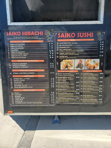 The food at this place is spectacular & the employees are also fantastic! I was in town getting my son situated in his college dorm & I needed some really good food. I'm not a burger or taco bell type of person so after asking around about various choices someone recommended this place. I went up a little before dinner time just to check out the menu in case my son & I decided to have dinner from there after his football practice. I talked a bit with Miguel and told him that I would be back around 7 or 715. He asked what I might want so I told him. My son & I returned around 715 & it was very darn impressive that they had my order ready! The portions were huge & we just couldn't believe the price compared to the food prices here in Las Vegas. My shrimp hibachi was really good and my son also enjoyed his steak. Considering the bad experience that I had at one of the hotels in Independence this small food truck made up for it & gave me hope that there are people who understand & believe in offering good customer service. My son said while he's there for school he'll definitely be visiting this truck again. Thank you Saiko Sushi & Hibachi & I wish you all the continued success you desire!...