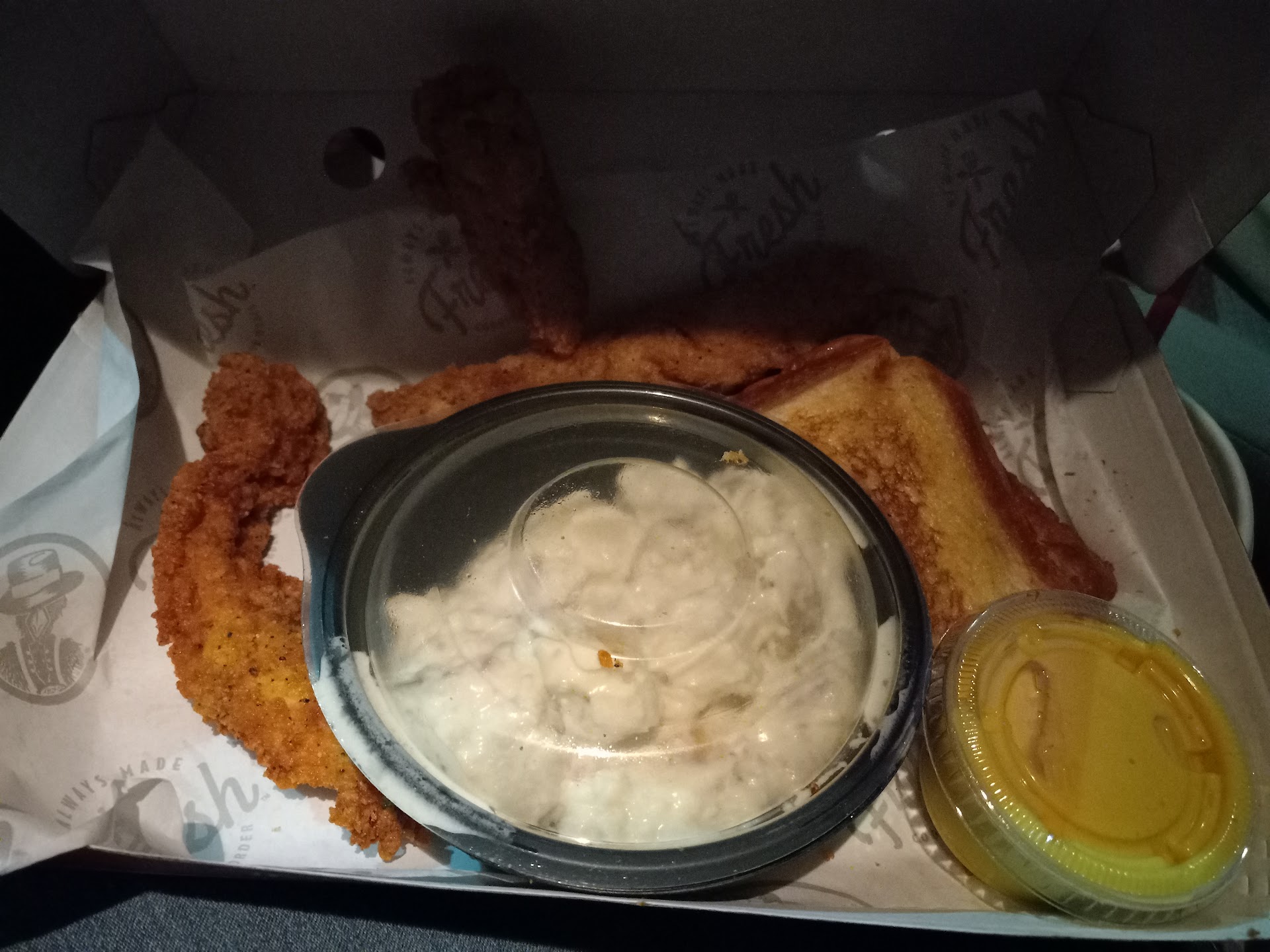We used to eat here couple three times a month. Once in a while we would get shorted a tender or bread, once got shorted fries. On my last visit that we ate there I was served what I belive was double fried tenders. My wife mentioned to the cashier she wanted two dipping sauces as the containers are never full and asked why we are charged for a second that is only half full. Then we got the chicken that appeared to be ones they rebattered and cooked again. They were twice the size and really dark.