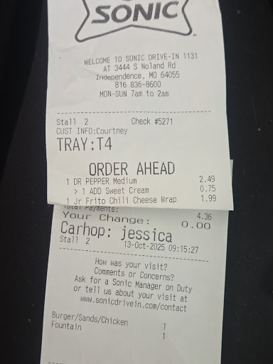 Read moreI've had many bad experiences at this location but today was the worst. I ordered the Sonic burger combo with mayo, minus tomato, with fries and a coke with a mini Butterfinger blast to finish. Well, the carhop comes out with my food,a medium blast, and no coke! I told her I ordered a coke with the meal and a mini blast so she said she would go make my coke and to keep my blast. I tipped her for her awesome service. I go to eat my burger, as requested there was no tomato. However, there was also no lettuce. Actually, there was one shred of wilted lettuce. Whatever, I can deal. Finish my meal and move on to my blast. I'm not kidding, literally the top quarter of the blast was Butterfinger and the rest was m&m. THEN there was whipped cream in the bottom. So I'm thinking they just dumped a different blast in a cup upside down and topped it with what I asked for? Or did I get ice cream from the scrap bin? I will not be going back.