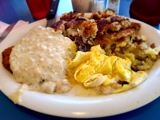 The menu is larger than what you'd expect for a small town airport restaurant. Prices very fair. I had the Bomb Raider skillet which was very large. Service was prompt and they were great about checking up on us throughout the meal (don't know if they have new staff or what- some previous reviews ding them for rudeness but the people we interacted with could not have been more pleasant). My food was very good though the jalapeños (much as I love jalapeños) overpowered the other flavors. Eggs were cooked to my preference and the biscuit-and-gravy side that came with the meal was delicious (I should have just ordered biscuits and gravy for my meal).