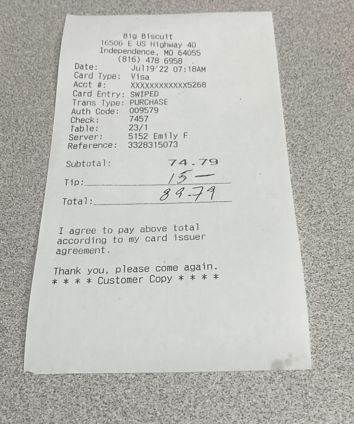 Kind of on a whim I told my server Emily that I was paying for the familyās breakfast and not to tell them it was me.