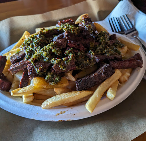 I'm going to give two stars for tonight with a chance to redeem themselves next time I go. This was our first time trying this venue and admittedly I do not like trying new places because there are too many unknowns. We didn't know it was their three year anniversary celebration when we arrived, but noted it was absolutely packed. We took the last parking space available and headed to the back of the building where a signed pointed to the restaurant. There was one sign saying seat yourself and that's all I saw. There was a long line of people up to the bar and no other obvious instruction of what to do. Personally if I was by myself I would have left at that point because there were no tables open and a large line of people and no one telling me what to do or where to go. My companions staked out a table and started asking other patrons till we found someone that told us you have one person claim a table and the rest order at the bar. No idea if this is the norm. We waited about 20 minutes to order. Their card readers weren't working so they had some issues with payments but that wasn't a big deal I don't mind paying at the end in fact I prefer it. Paying in the beginning stops me from ordering more drinks/tipping etc. After waiting awhile an employee let us know that several items we ordered were unavailable. We all changed our orders to fit into what was available. We waited another bit and one person at my table got his food. He finished his food while my husband and I waited for our sandwiches. My sandwich was not the first order or the second I asked for when it arrived. It was just steak bites on bread haha. The owner apologized and said they were very short staffed and having difficulties. Now for the good part: everything tasted good even if it wasn't what I ordered. Presentation was okay- they looked like gray plastic ikea plates which totally clashed with the rest of the vibe though( maybe these were backups because it was swamped). Premises are nice and the outdoor space looked particularly lovely there just wernt any tables available outside when we arrived. I would prefer to have clearer signage or communication when arriving for what's expected and they could work on communication about what's running low obviously. I would have really liked to try the brisket or the pulled pork sandwich as they both had toppings which probably made them a little more interesting than bun with plain meat. I think that this space was underprepared for the busy night and maybe needs a better system.I am optimistic that going during a less busy night might yield a better time and will give more stars if this turns out to be true. Also I didn't see a sweet option, but a tiramisu/empanada/flaky pastry and coffee would have really gone good with...