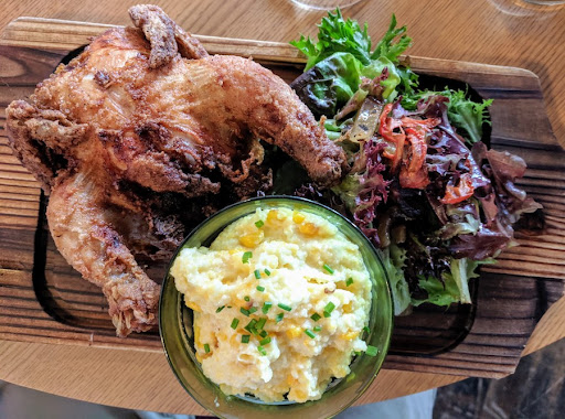 I had the game hen, fried. Served with small salad and grits. Frog legs, steak, roasted cauliflower (delicious crunchy yogurt side dressing) and roasted beet salad were the other dishes. The hen was crunchy on the outside, moist on the inside and delicious. Steak done a tad over MR, salad and fries accompanied. I believe he enjoyed it as there was no evidence. E anything had been on his plate. Same for all the other dishes.