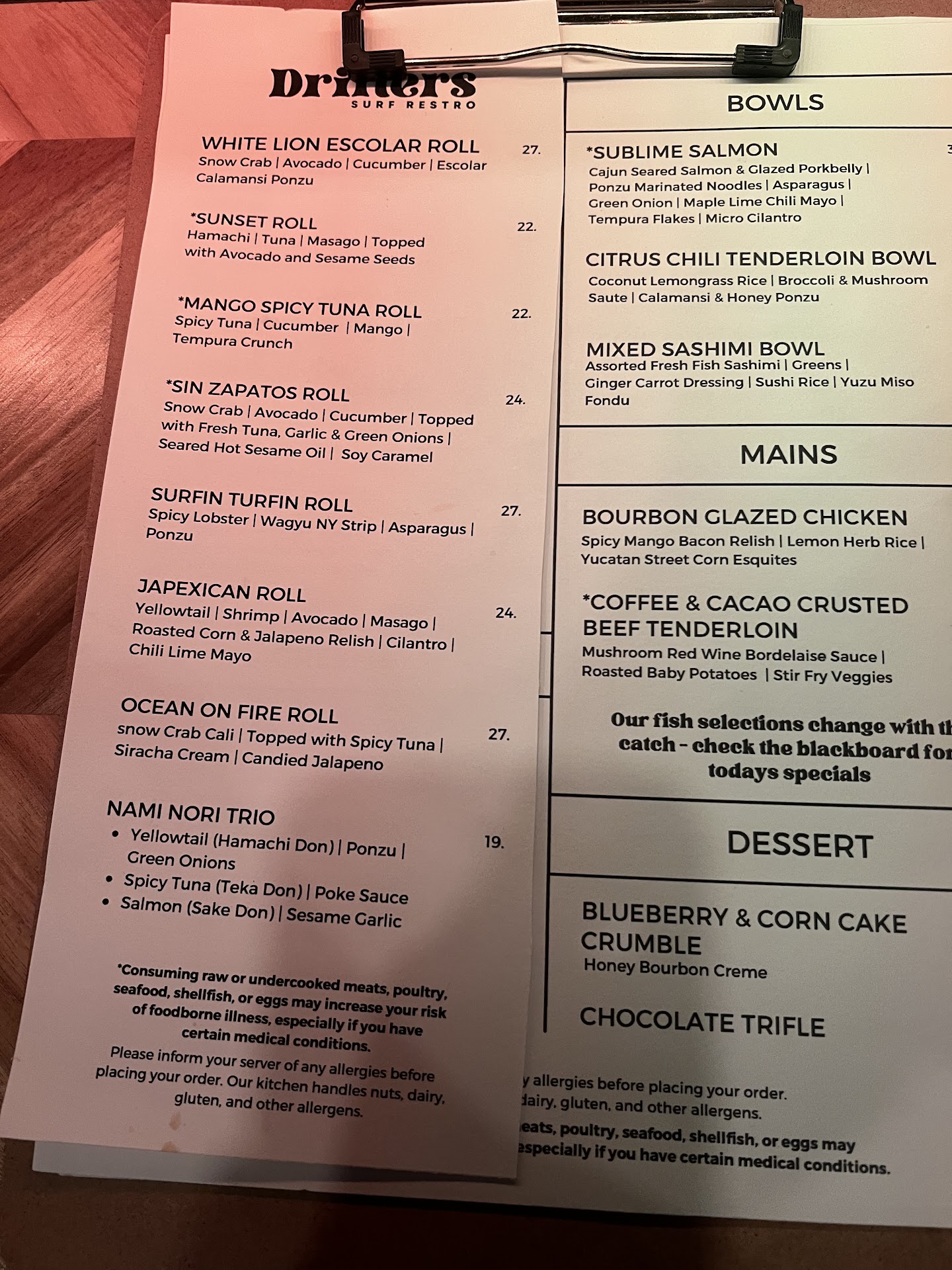 Read moreWe went to the soft opening phase of Drifters Surf Restro last night in Indian Harbour Beach and wow, we were blown away. The location is in the same strip as Happy Healthy Human and the Ace Hardware, and we’re delighted to have this in walking distance to us. The owners have done a fantastic job on the decor, creating a cool and relaxing beach/water/natural aesthetic. The owner was incredibly friendly and explained everything to us stopping to chat and check in and genuinely wanted feedback. Everything was perfection which for a soft opening is a rare occurrence. The ceviche was fresh and flavorful, paired perfectly with a chilled Albariño. The star was the coffee cacao crusted tenderloin with a truffle polenta and fresh vegetables. Cooked perfectly with intense flavor and a delicious sauce. I’ll be dreaming of this dish for a long time and can’t wait to go back for it. This is my go to order in a restaurant and I haven’t had a better order of beef in a very long time.